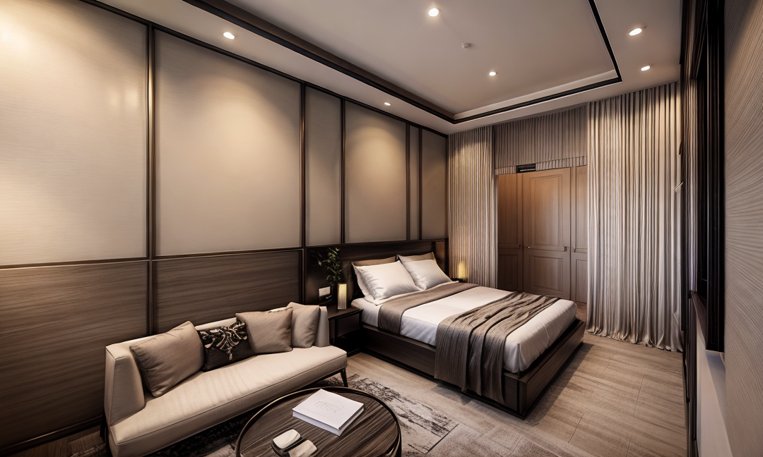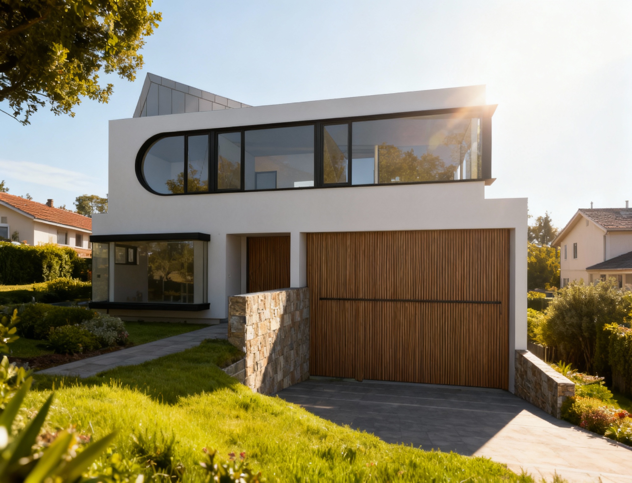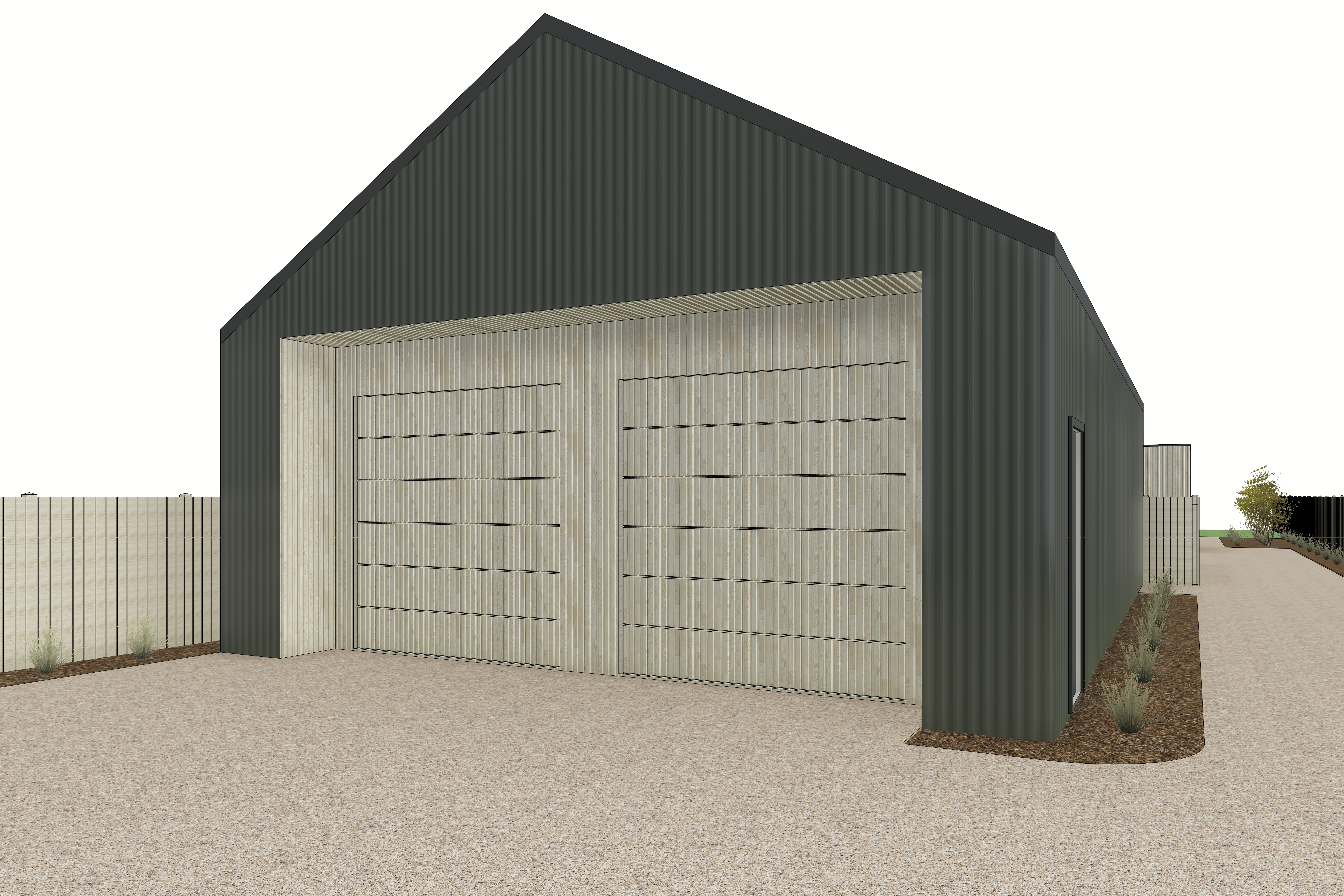 make ultra realistic but keep image geometry modern shed with corrugated black cladding and inset feature larch timber paneling vertical beige gravel driveway and mulched garden beds alongside tall gum trees behind with timber fencing party cloudy sky with front on morning sunlight warming the scene
