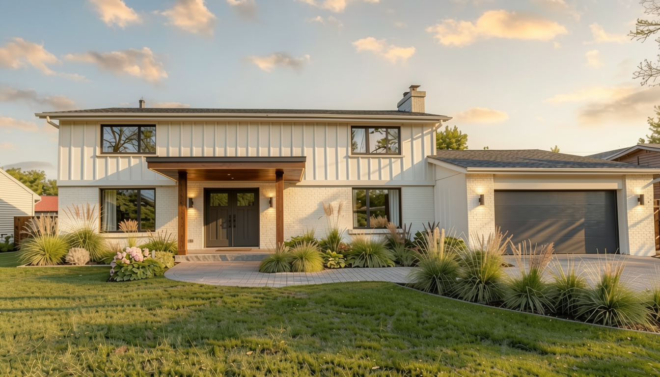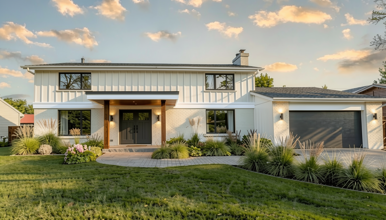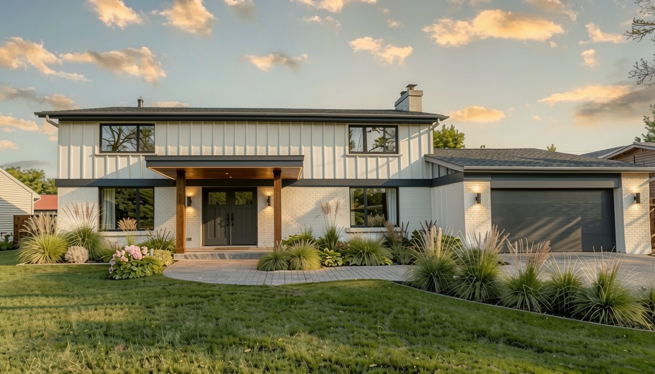 increase the size of the horizontal wood beam above the entry posts so it reads as a strong structural element the beam should be slightly taller and more defined make the canopy above the beam thinner and flatter with minimal pitch keep the wood posts thick and modern do not change the rest of the house