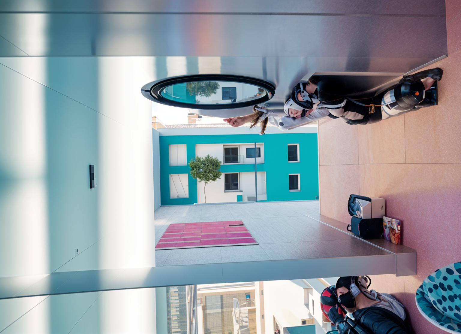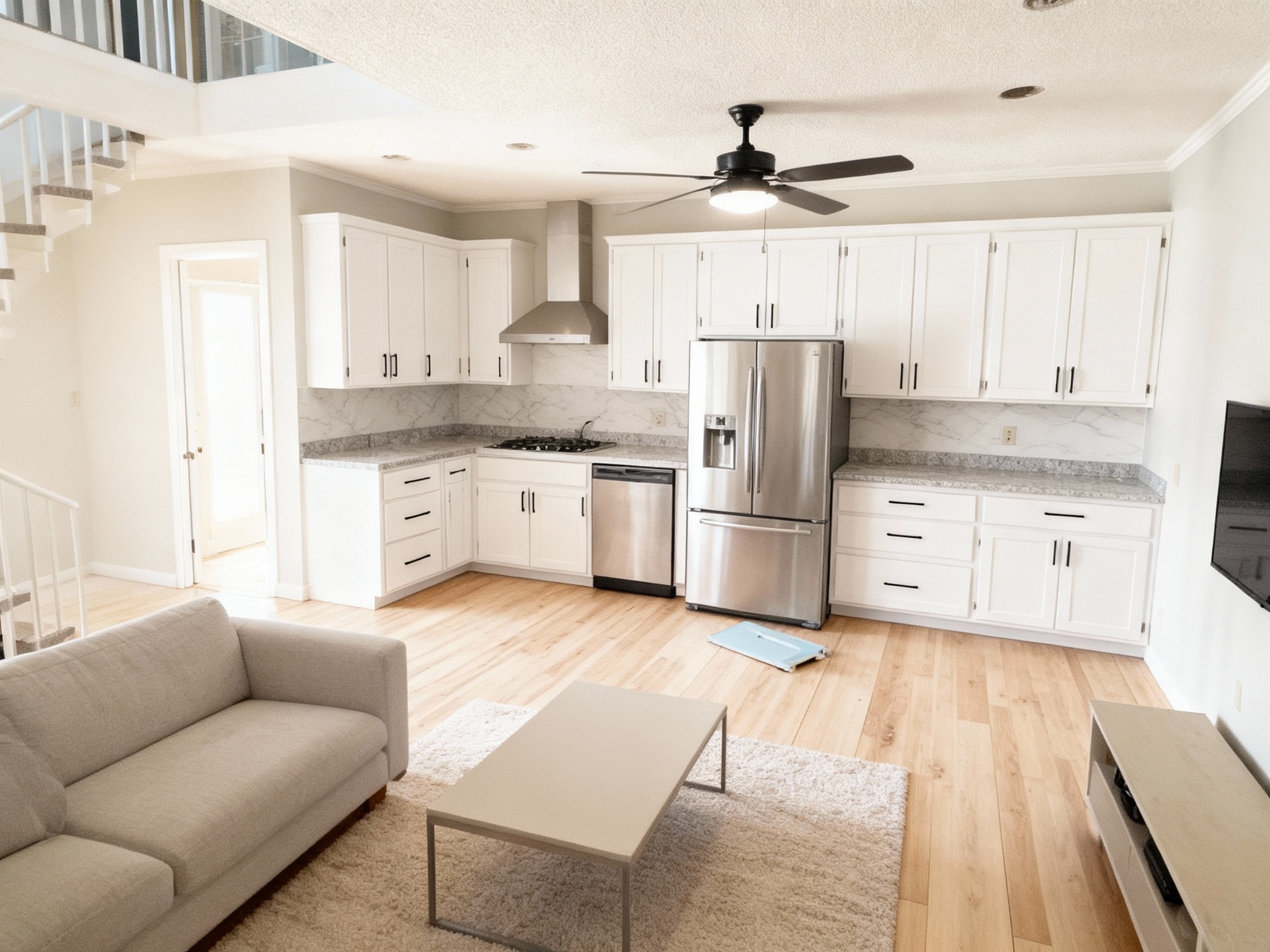 keep the camera angle perspective and overall layout exactly as shown do not move or resize any windows doors lighting junctions walls or existing appliance locations goal update to a warm modern aesthetic while preserving the current layout kitchen replace all existing cabinetry with new full overlay white shaker style cabinets 3 rails stiles matte finish simple modern look include matching white shaker panels and toe kicks install modern linear black hardware 6 8 bar pulls on doors and longer 10 12 pulls on drawers countertops warm light to medium gray quartz with very subtle veining eased edge add a matching gray quartz backsplash only where there is currently backsplash otherwise keep painted wall replace the empty space to the left of cabinet with a stainless steel refrigerator in the same footprint align with existing cabinet run do not change openings all other appliances to be stainless steel do not change the positions of the range dishwasher sink or any electrical outlets switches ceiling fans and lights replace any holes in ceiling with simple 4 recessed lighting with white trims replace any existing fans with simple modern white ceiling fans with a small integrated light do not relocate fan junction boxes flooring replace all flooring throughout the visible space including the kitchen tile area and room in the rear with warm white oak wood plank flooring matte finish long boards running parallel to the long walls lengthwise across the space no thresholds continuous flooring furnishings and styling foreground create a modern living room layout low profile neutral sofa light warm gray or beige simple coffee table soft textured rug and a clean tv media console with a wall mounted tv on the right wall keep pathways clear to kitchen and rear room foreground near the left and the kitchen add a compact modern dining table with 2 chairs wood and black metal mix to echo hardware fans minimal decor warm ambient feel add a few warm accents wood soft textiles but keep it uncluttered walls paint and trim maintain existing wall and ceiling positions refresh paint to a soft warm white to support the warm modern feel with crisp white trim do not add new wall features or change openings scene requirements daylight similar to the source image clean the space remove any debris or objects on the floor no cords no boxes no construction mess high realism photorealistic materials and accurate reflections on stainless steel preserve all proportions negative constraints do not alter the layout move appliances except refrigerator in that same spot relocate lighting change window door sizes or positions modify the staircase loft add islands peninsulas add upper cabinets that block vents or introduce ornate traditional elements no exposed brick no open shelving unless already present no glossy high contrast veining on countertops