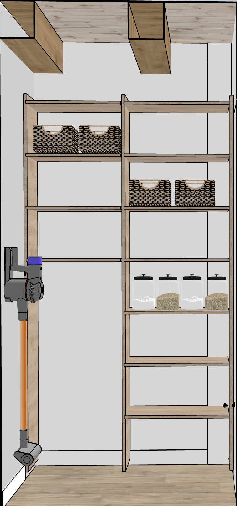 this is a storage compartment for groceries a mop paper the dyson hangs on the left side on the wall