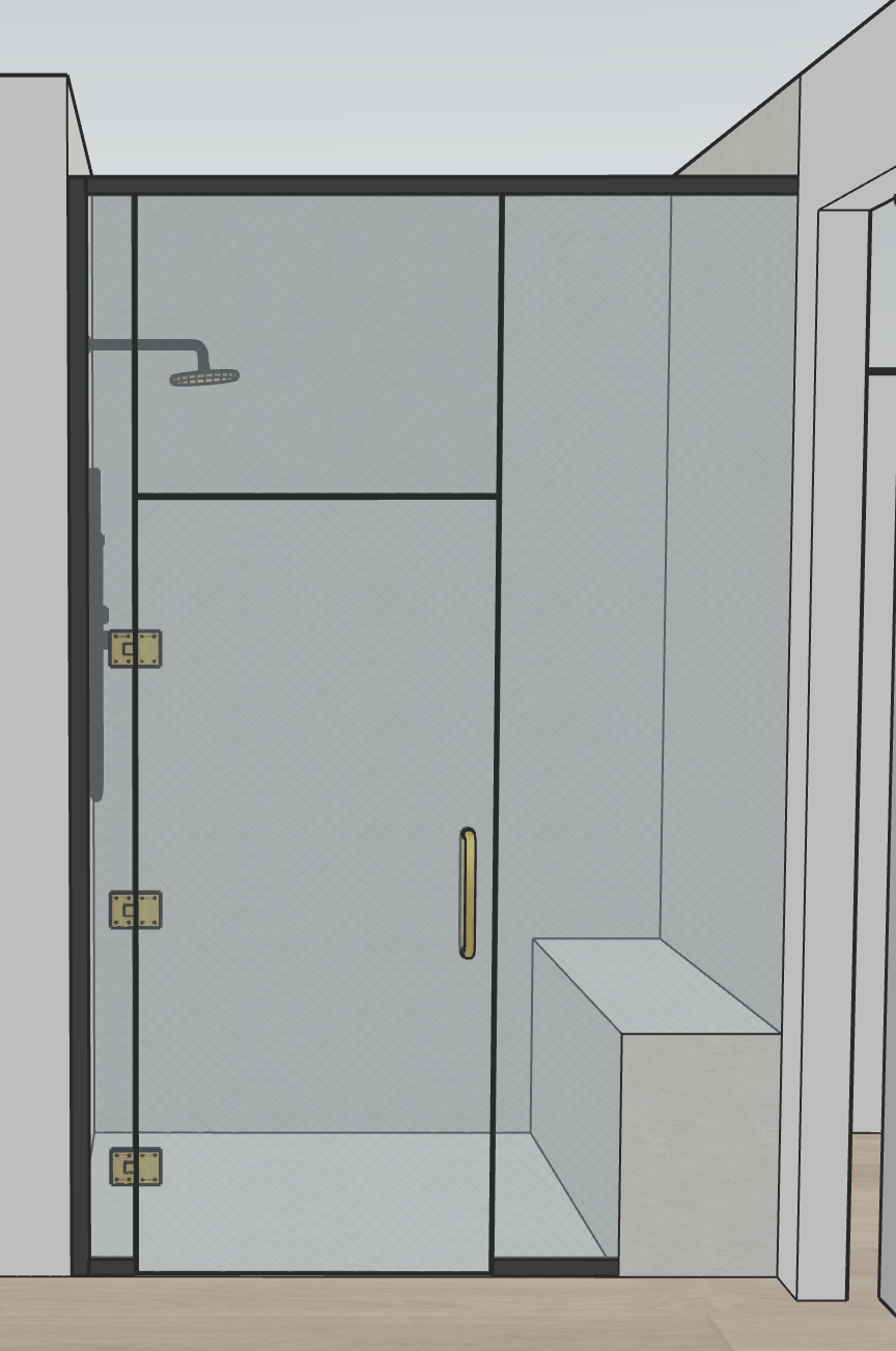 large luxury modern minimalist shower all shower walls and bench light grey beige travertine brushed gold plumbing fixtures all on left wall white large tile flooring frameless shower