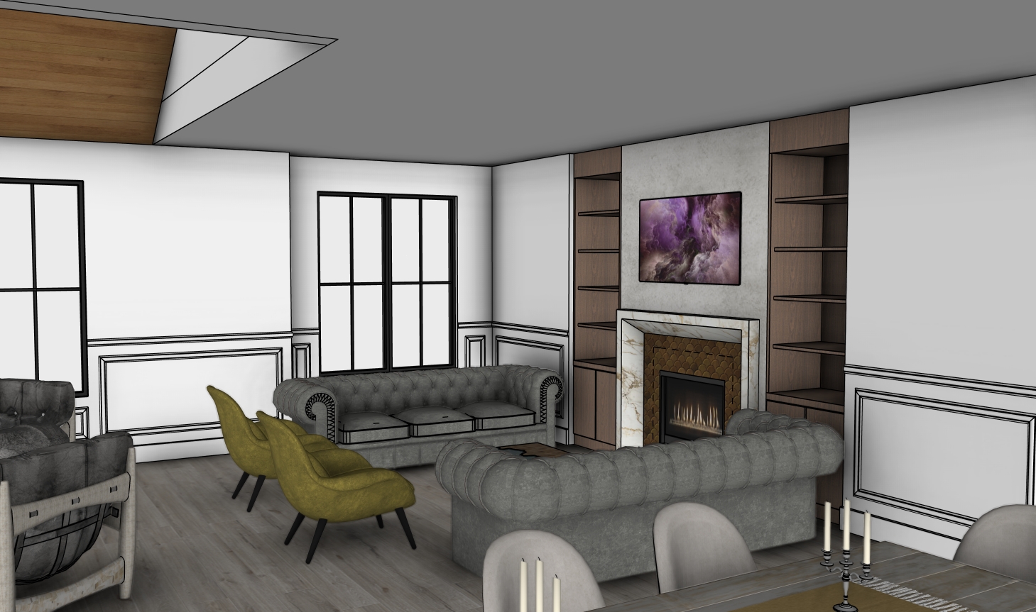 soft sunlight coming in through windows add some details to shelving like books and picture frames mabe a rug and some soft detials nothing too cluttered it should be nice and crisp and tidy and modern