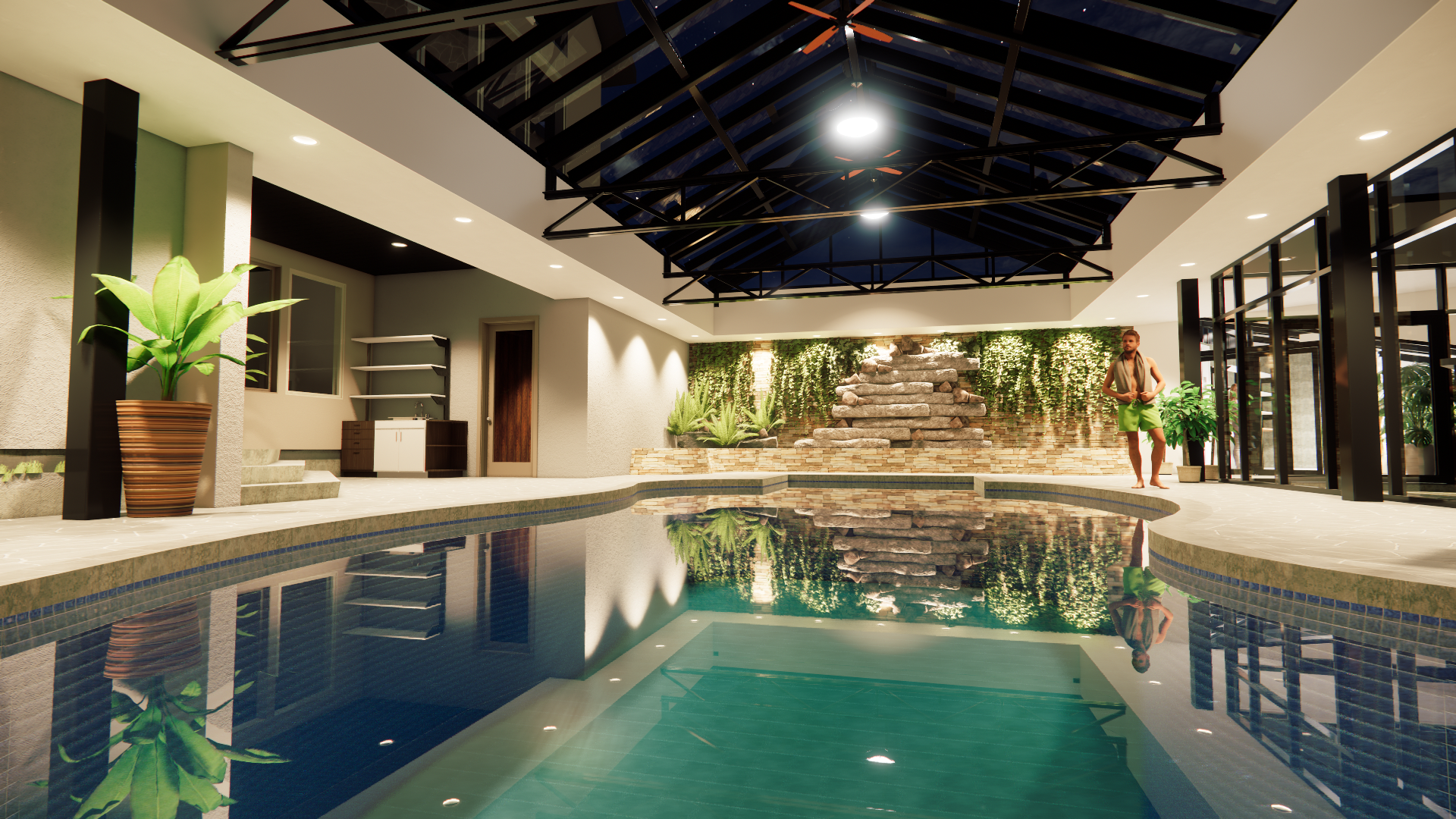 a pool house with a glass roof floral and greenery surround the pool while people relax in the water