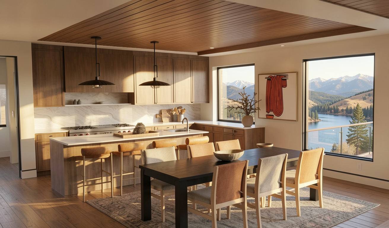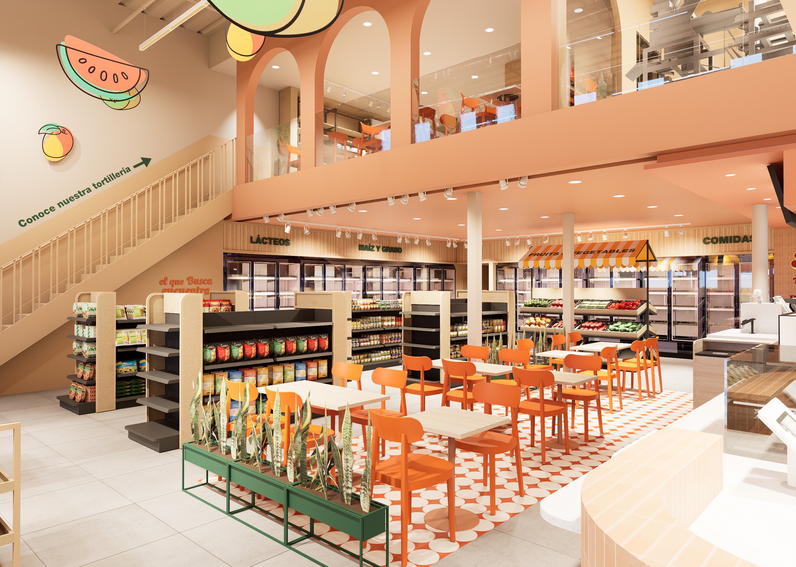 enhance the existing architectural scene by adding realistic people and completing product stocking only local neighborhood supermarket interior based strictly on the provided image people additions a small group of customers seated at the central tables casually eating tacos and talking naturally one person walking up the staircase on the left mid movement one staff member visible on the upper level behind the large glass window next to the tortilla machine wearing a green work apron performing a natural working pose product stocking complete all grocery shelves with realistic packaged dry goods grains canned foods sauces snacks respecting shelf type and scale fill refrigerated displays according to the indicated categories dairy produce fresh items clean and organized realistic density maintain exact architecture furniture layout materials textures colors signage lighting and spatial proportions warm accent lighting with neutral ambient light preserved exactly as in the base image realistic human scale natural poses correct perspective soft contact shadows photorealistic integration everyday life atmosphere architectural visualization quality