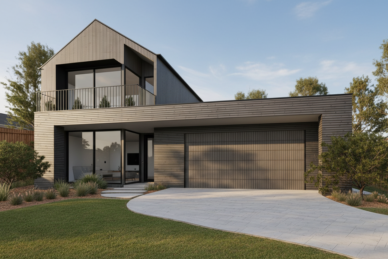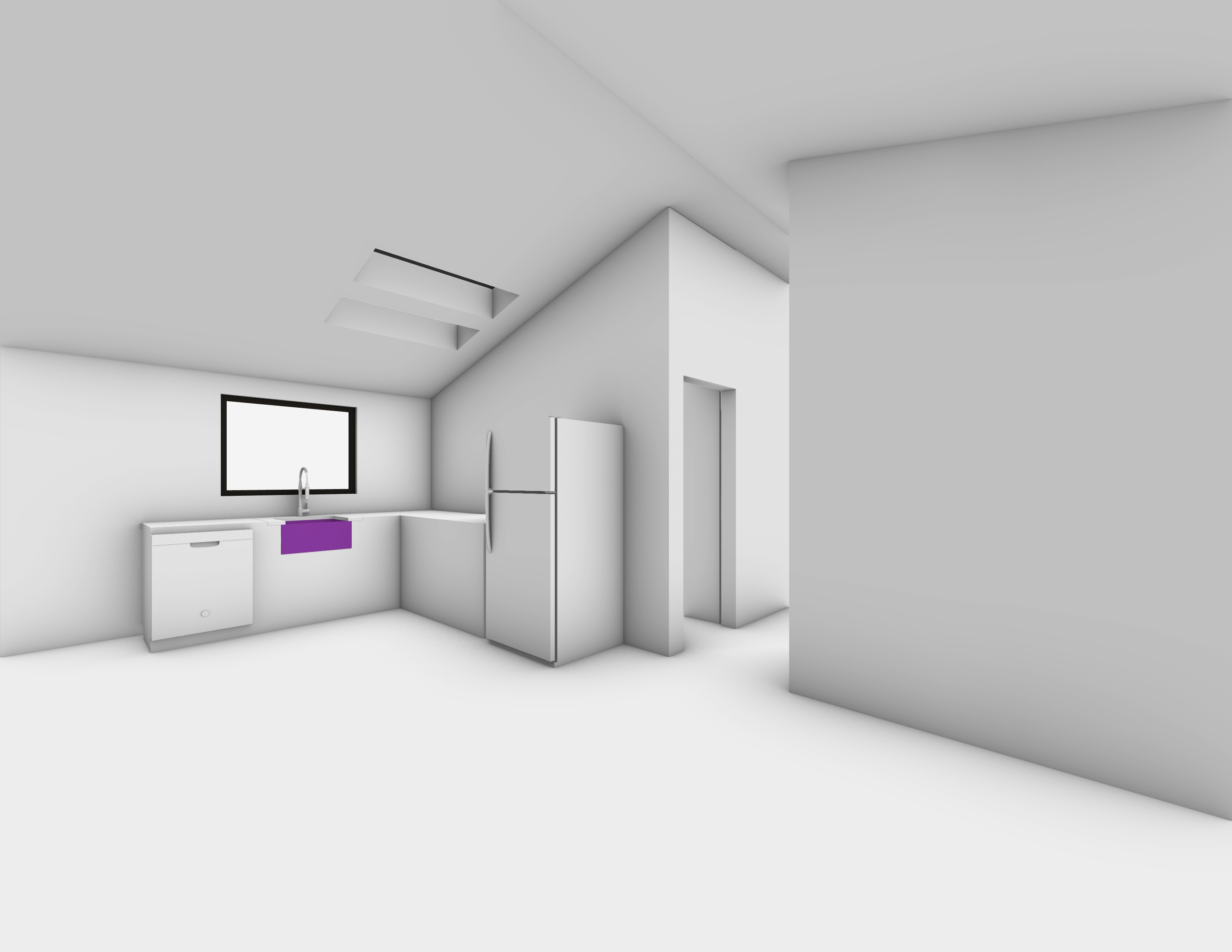 interior shot of kitchen and living room valuted ceilings with recessed light balanced with natural light from windows all wall are soft white with matte finish counter top is white as well with grey matte kitchen appliances flooring is engineered wood its mid day with light coming in from recessed lighten tv mounted on wall to the right
