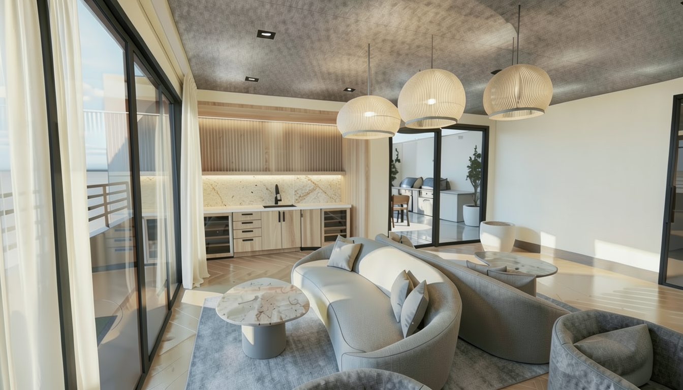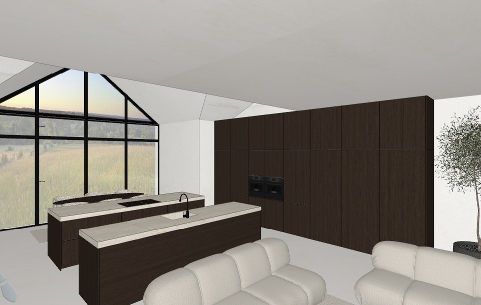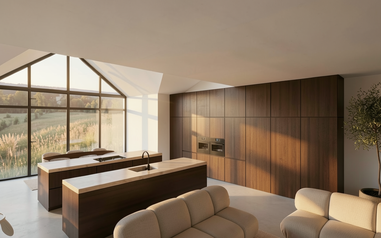 a dark modern kitchen with dark oak luxury veneered cabinets and a matt rough travertine worktop