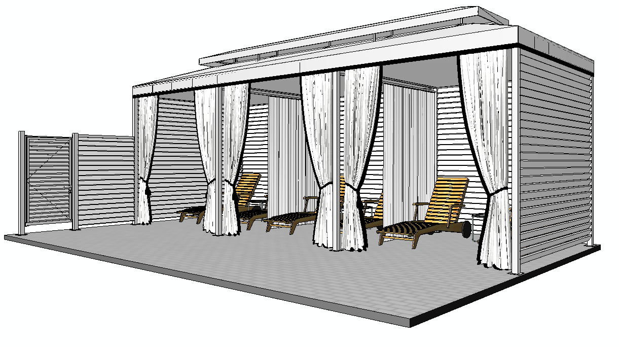 ultra photorealistic render of the exact same cabana structure shown in the reference image do not change or modify any geometry proportions layout wall positions platform size curtain placement fence location louvers or roof structure everything must remain 100 identical in shape and position a luxury white cabana with white fabric canopy roof with black contrast trim white heavy curtains with black contrast edging curtains tied back exactly as shown white louver style wall panels on sides and back white gate and fence panel on the left side three wooden loungers same shape and position with armrests and wheels additions realism only no design changes on each lounger striped black and white cushions and pillows subtle fabric texture on curtains light wood grain on loungers environment the cabana is located at an upscale luxury resort in west palm beach palm trees in the background tropical landscaping clean stone terrace ground hints of elegant hotel architecture in the distance clear blue sky bright coastal atmosphere lighting mood bright sunny daytime florida light strong natural shadows crisp highlights fresh high end resort feel render style 8k photorealism real textures fabric wood metal pvc true to scale proportions camera angle identical to the reference do not change geometry dimensions positions layout curtain configuration fence placement lounger placement only enhance realism no redesign