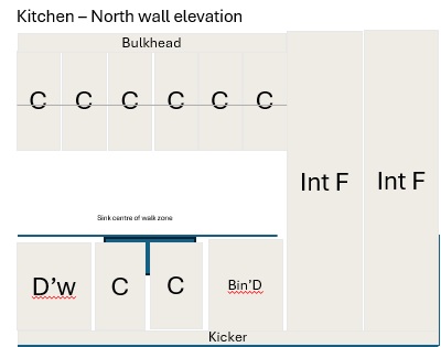 turn this joinery elevation into an image the overall length is 4 1m the splashback should be 200mm high calacatta verde marble and match bench top d w is integrated dishwasher inf is integrated fridge bin d is a draw for bins