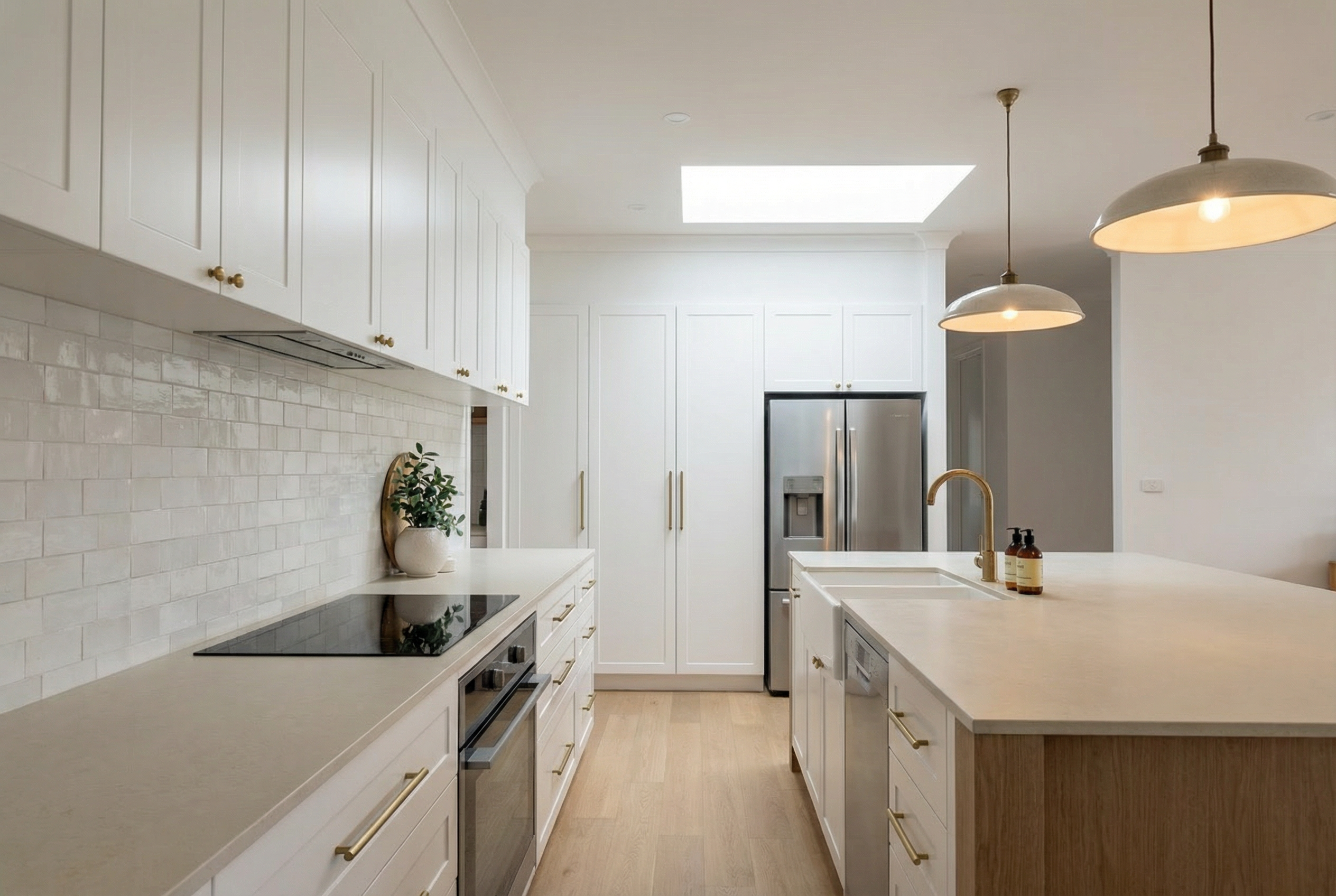 all cabinetry to be white shaker style pendant lights are these https lightingcollective com au products traditional ceramic pendant assorted size stone bench top to be https www caesarstone com au colours 4001 fresh concrete it is a creamy light tone hand soap near kitchen tap is https alivebody com au products kitchen trio lemon pomegranate variant 43810328314096 country au currency aud tp cid 22748875176 tp id 762054959221 tp pid shopify au 8213717549296 43810328314096 tp source google gad source 1 gad campaignid 22748875176 gbraid 0aaaaab01yxqhra7btn0qohrmvf8mq dro gclid eaiaiqobchmi3frx89lfkgmvtmjmah3j5xlzeayyasabegisyfd bwe splashback tile is https dilorenzo com au products zelij collection chalk gloss size to be 100x100mm square stacked please also include one skylight between the back cabinetry run and island bench to be centred between oven and sink timber finishes to be light oak bulkhead above full height cupboards feature tile to be square 10cm x 10cm stacked