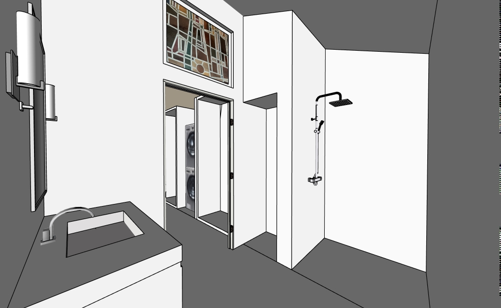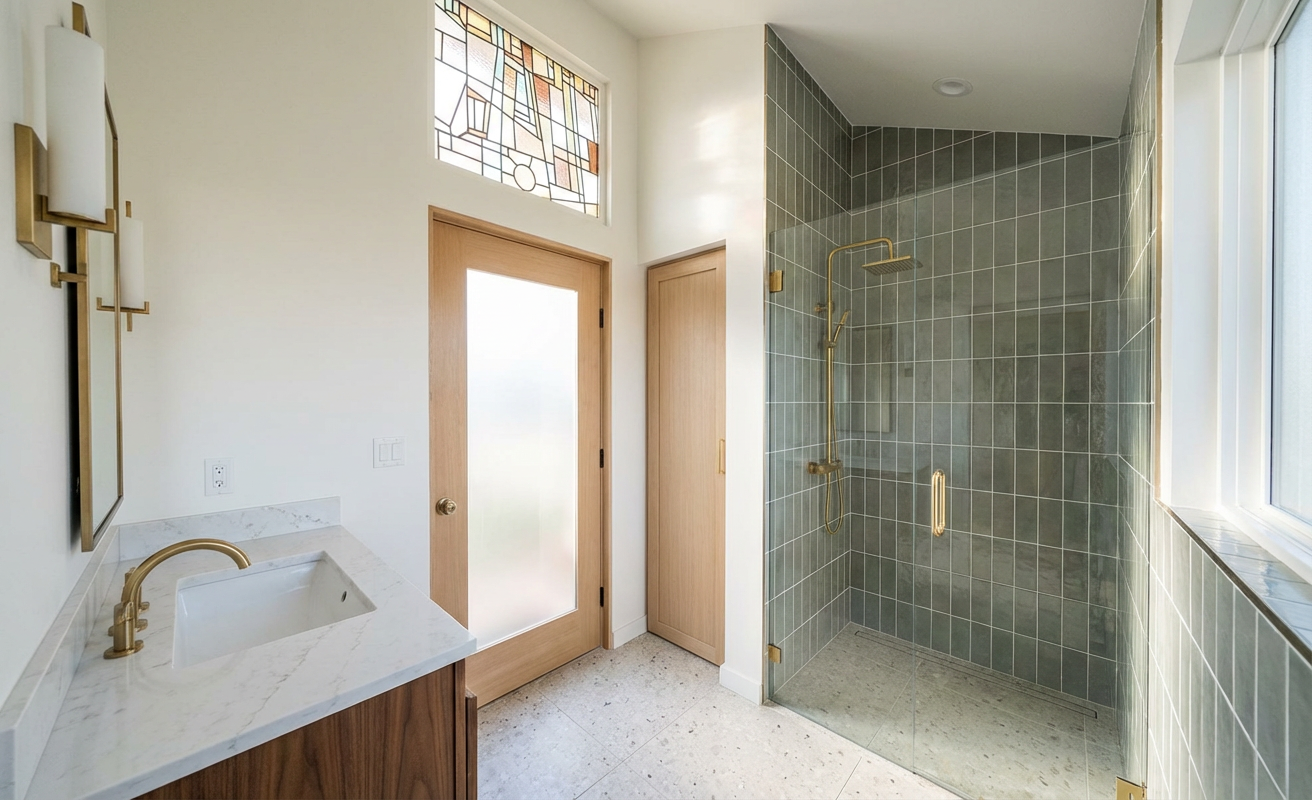 photorealistic image of a bright coastal style bathroom interior full height backsplash walls inside shower vertically oriented rectangular ceramic tiles approximately 4x12 proportion laid in a perfect grid with crisp white grout lines tiles rendered in light to medium gray green with subtle texture shading to show the vertical orientation and slight sheen brass shower fixture with a clear shower glass door large beige tone terrazzo tile flooring solid wood cabinetry in medium dark wood tone with visible straight grain and matte finish thick white marble or quartz slab with very subtle veining polished surface right white with soft gray shadows underneath the overhang the door is light wood full lite frosted glass next to the shower glass add a small linen closet door