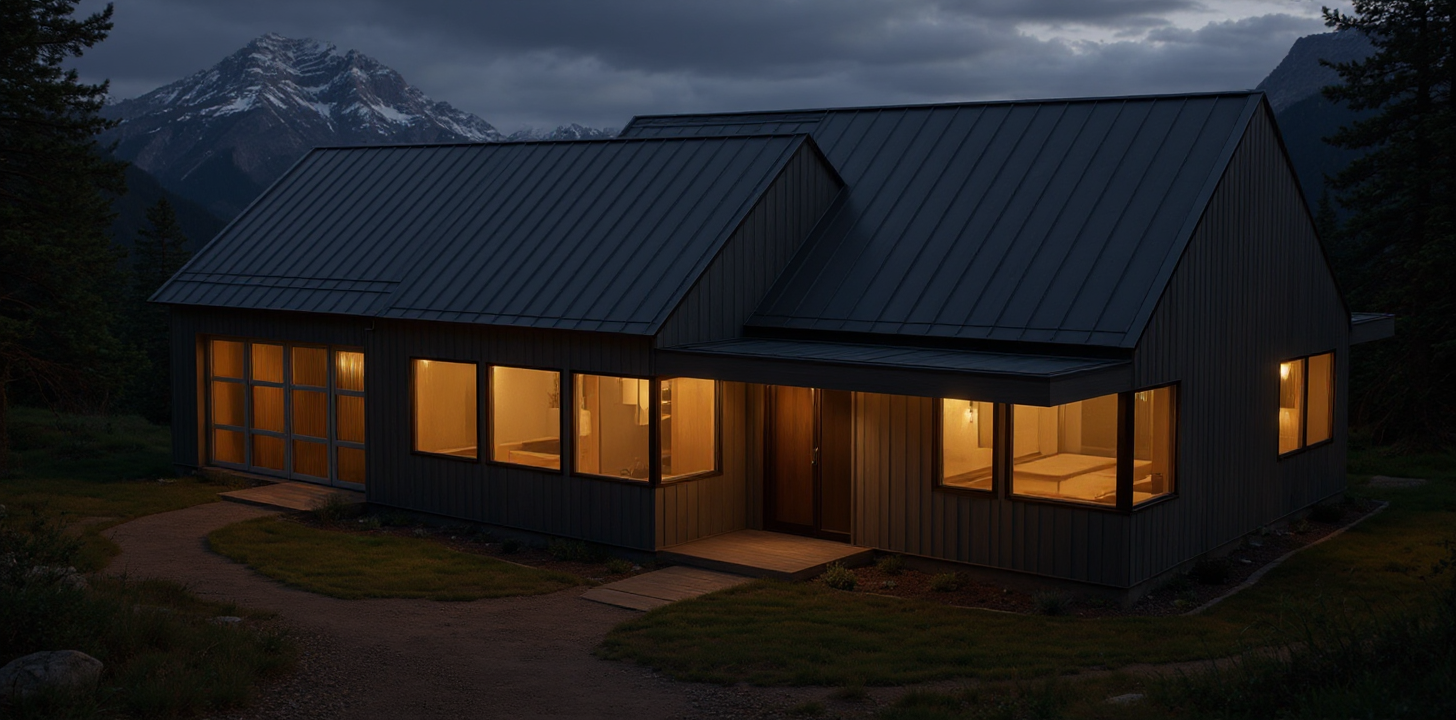 clean timber clad architectural exterior rendered in cinematic bright golden hour lighting dark trim around sliding barn doors warm vertical wood siding with similar simple minimal grain pattern grass foreground black standing seam metal roof visible prominent cinematic lake with surrounding trees landscape in the background natural wood textures high fidelity photorealistic visualization crisp shadow falloff refined facade geometry richly detailed grain patterns soft atmospheric depth premium architectural photography mood ultra clean composition and materials