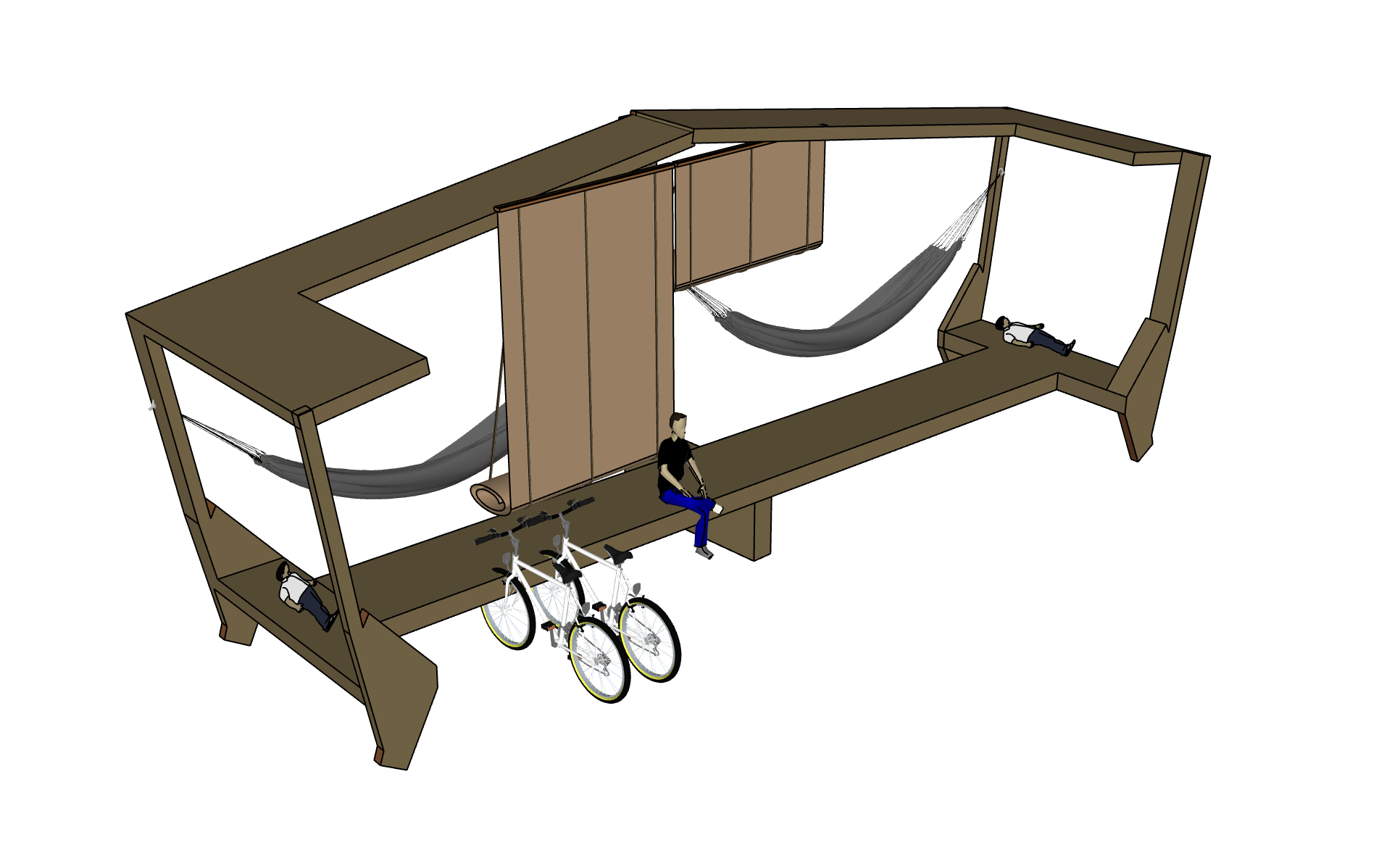 render this wooden bench with curtains ans back support hamaca and bike stand in the bench it is all wooden and easy make it 100 acurate to the picture