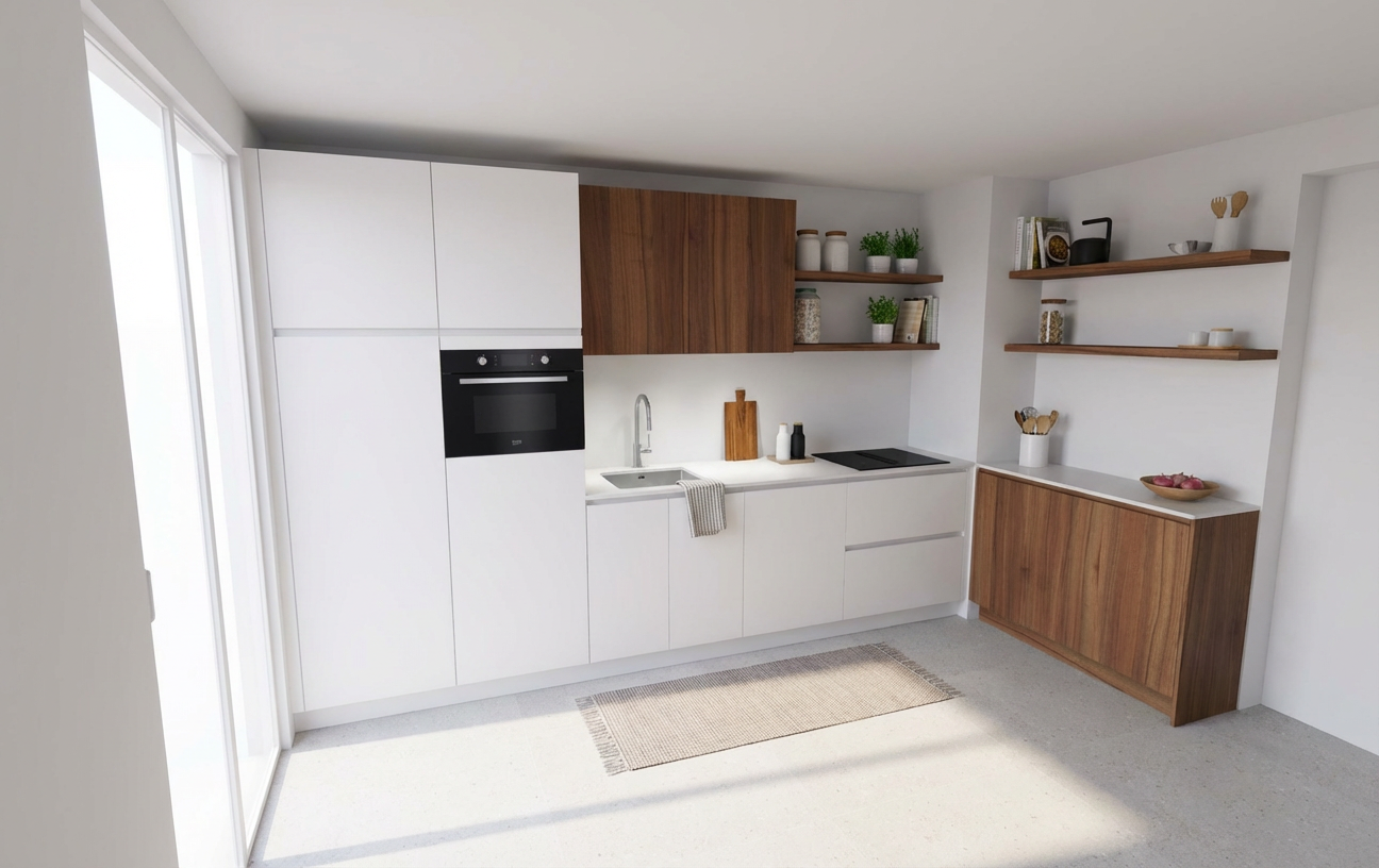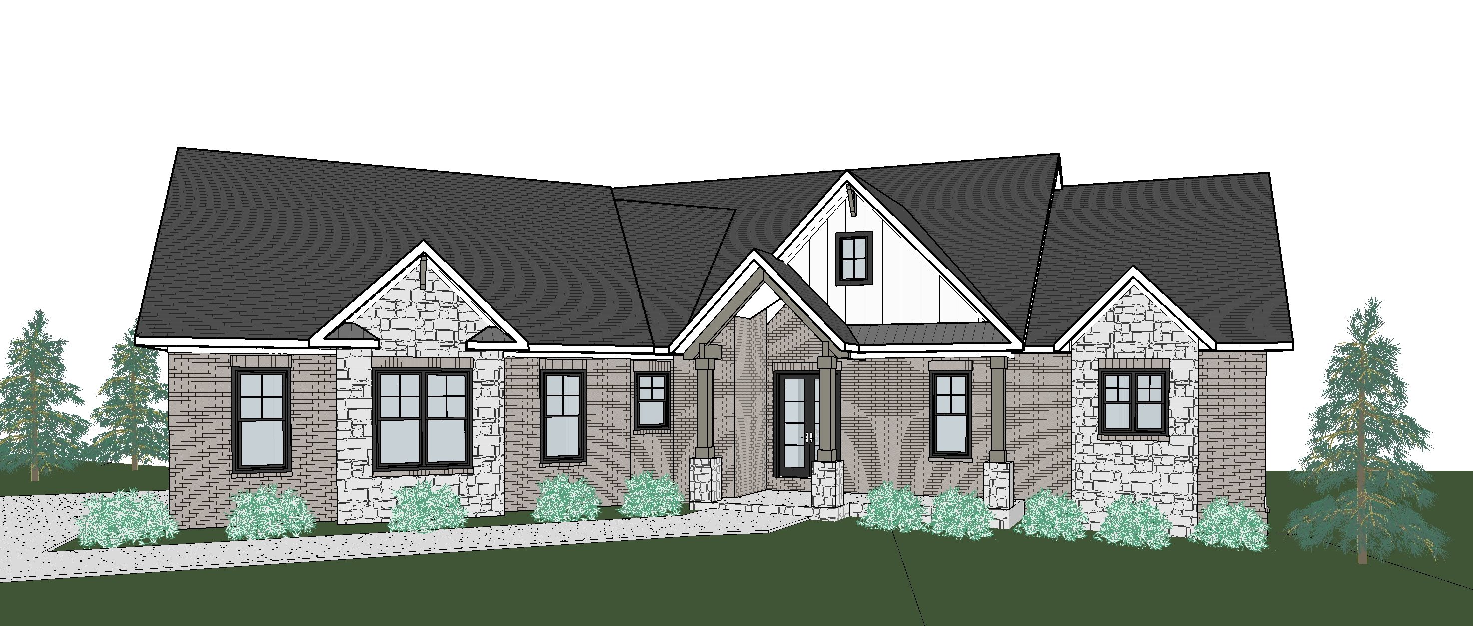 render a traditional house with earth tone brick and stone light grey siding blue sky with few clouds evening sun vibrant landscaping with large pine trees
