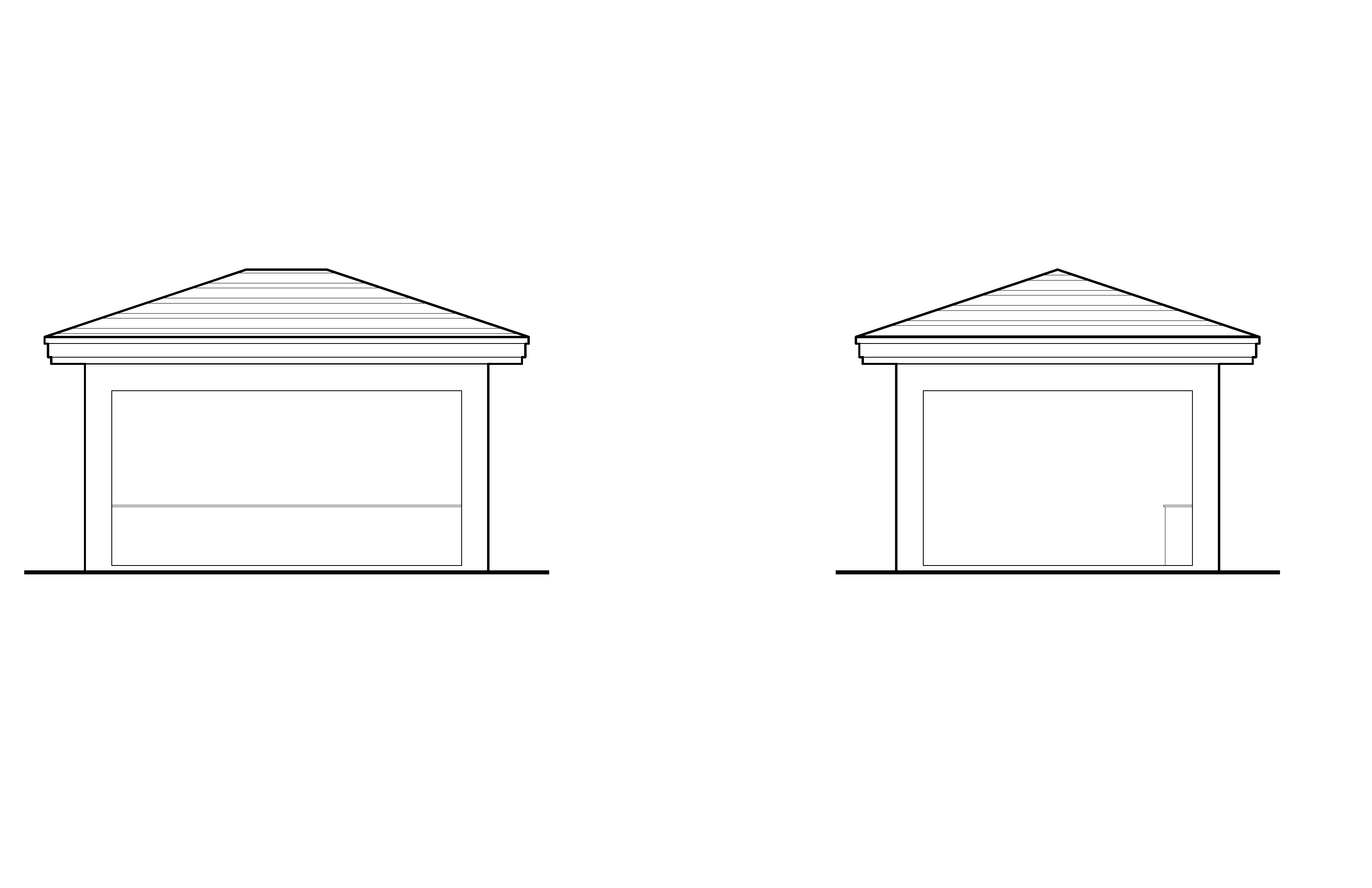 this image is of two elevations views black flat tile roof black fascia dark grey stucco there is a summer kitchen shown along the back wall show some stainless steel appliances and a grill in the denter with a stailess steel grill hood above images are no connected structure is open on opposite sides cabinets are only along the back wall of the image on the right and the right side is open