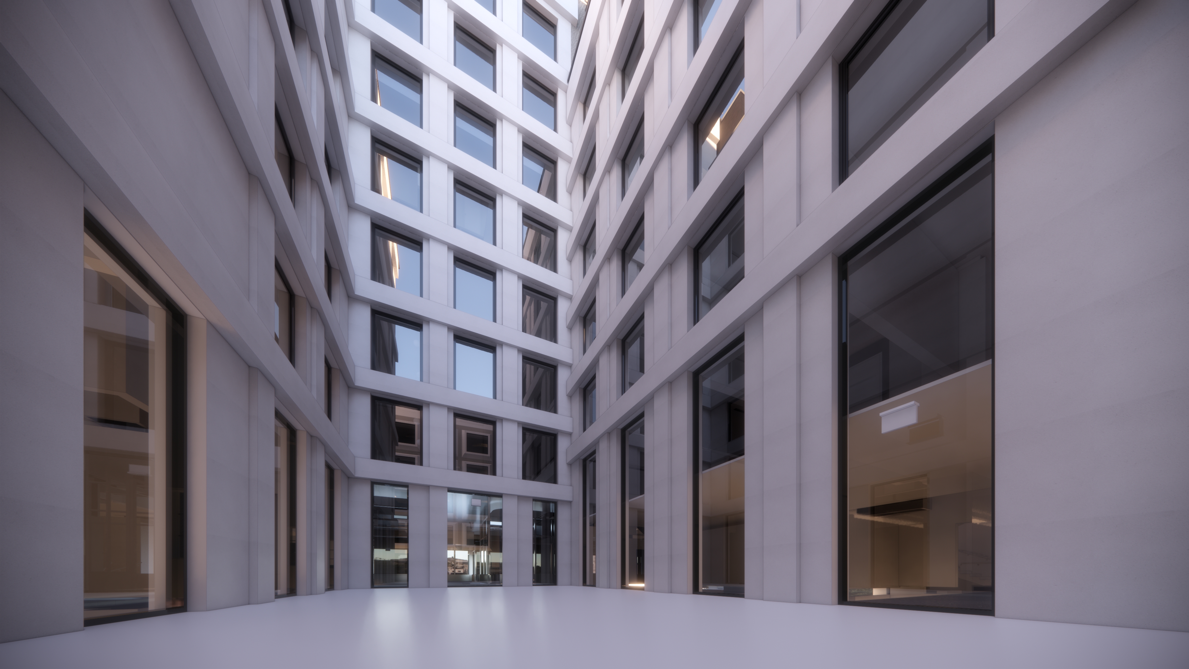 improve reflection and light in this courtyard add people and a small water sculpture on the right there is an hotel entrance