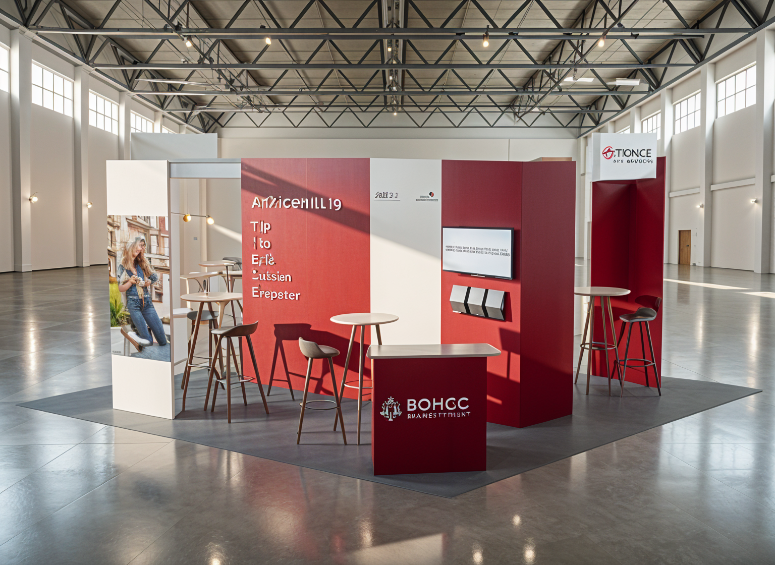 create a shaded aerial view of the floor plan in warm neutrals with green turf flooring inside golf simulator box only and medium hardwood floors throughtout the rest of the space white sofa and chairs with colorful print fabric on toss pillows 42 white wood table with four upholstered chairs murphy bed is white king bed