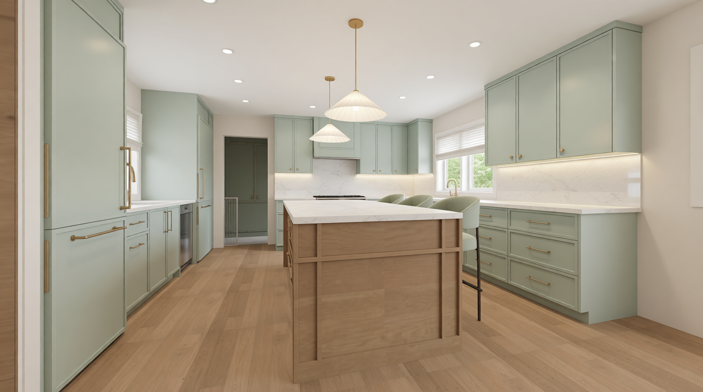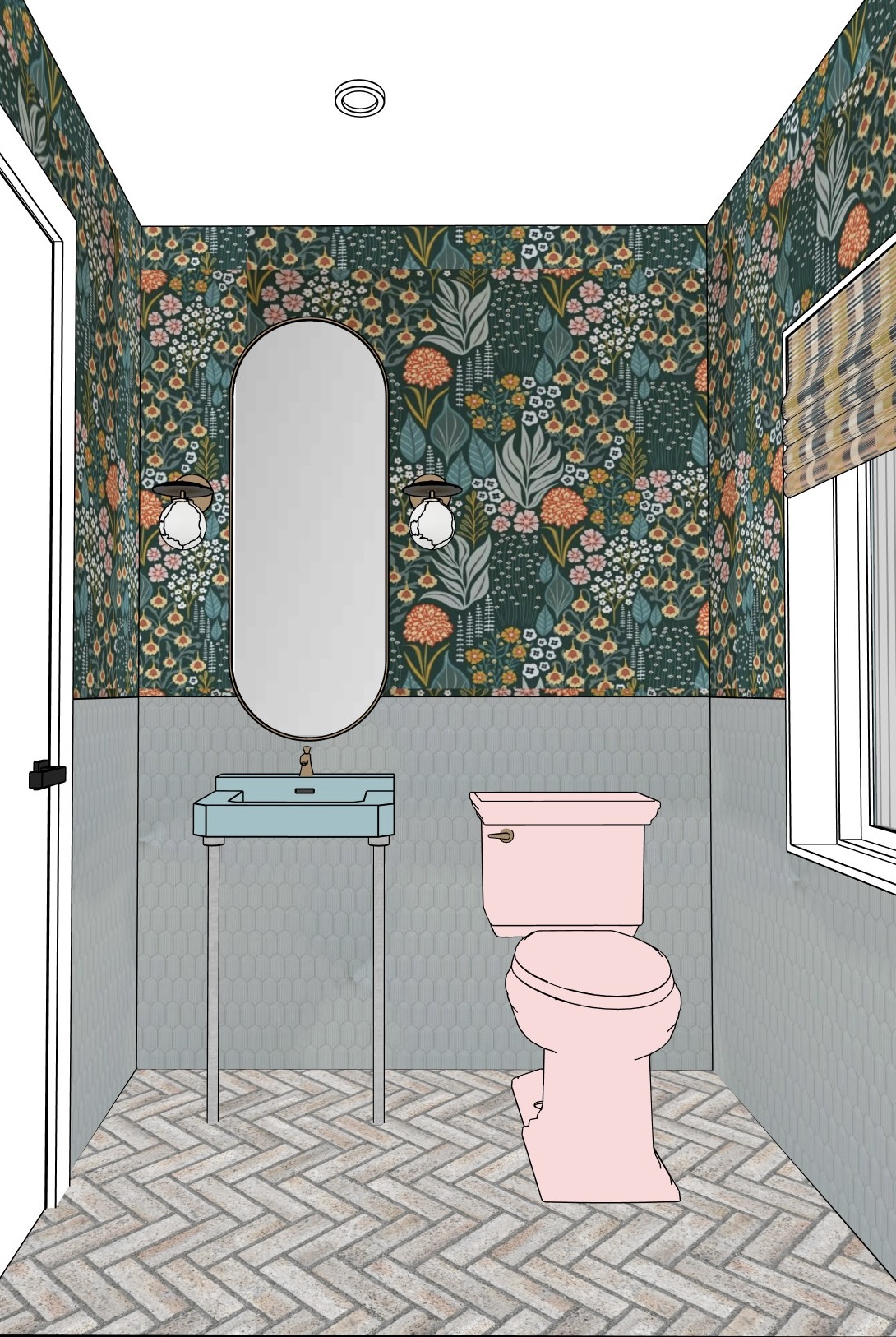 small powder room interior straight on frontal view symmetrical composition walls fully wrapped with a continuous seamless dark green botanical floral wallpaper applied as a single uninterrupted surface with no visible seams no pattern breaks and perfect alignment across all walls the wallpaper features dense foliage flowers and leaves in muted tones of sage green teal soft pink mustard yellow and cream with a classic illustrative pattern lower half of the walls finished with light gray vertically stacked elongated hexagon tiles kit kat style matte finish forming a wainscoting around the room floor finished with light gray and beige herringbone patterned tile subtle texture natural stone look centered on the back wall is a vertically oriented arched mirror with a thin dark bronze black metal frame on each side of the mirror there is a wall mounted sconce with a dark bronze base and arm holding an oval white opal glass globe shade below the mirror a small wall mounted light blue vanity sink with integrated basin and flat rectangular shape supported by two slim metal legs in a matching dark tone single hole faucet in a warm brass finish mounted on the sink to the right of the vanity a classic style toilet in a soft blush pink color including tank and bowl with a side mounted flush handle in brass finish white ceiling with a single recessed round ceiling light centered in the room left side shows a white interior door with black hardware partially visible right side shows a window with white trim and a woven roman shade in natural beige and light brown tones lighting is soft and even no dramatic shadows neutral daylight feel clean styled interior no people no accessories added no changes to materials colors layout or proportions realistic architectural illustration style clean lines accurate scale
