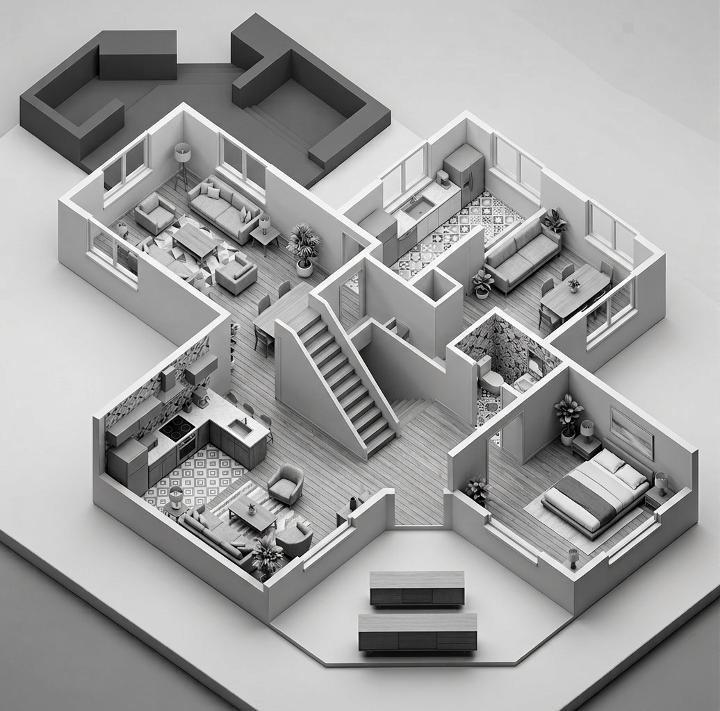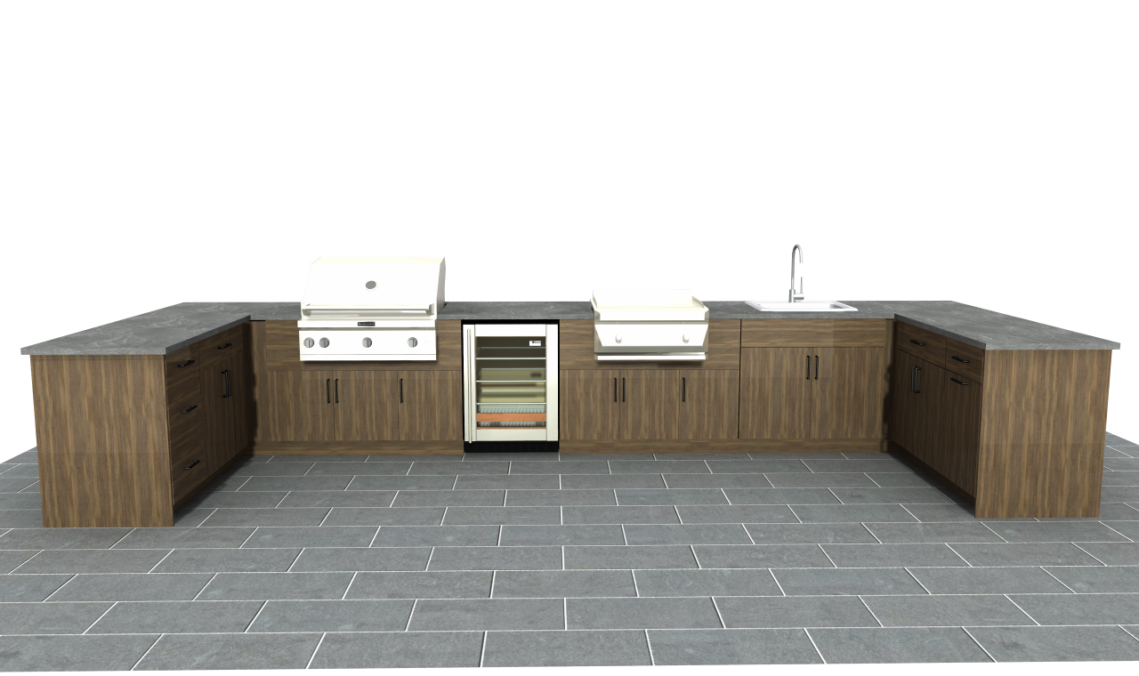 add white vinyl fence close behind kitchen add backyard scenery behind fence add wood pergola over the kitchen add a few food items and beverages on countertop