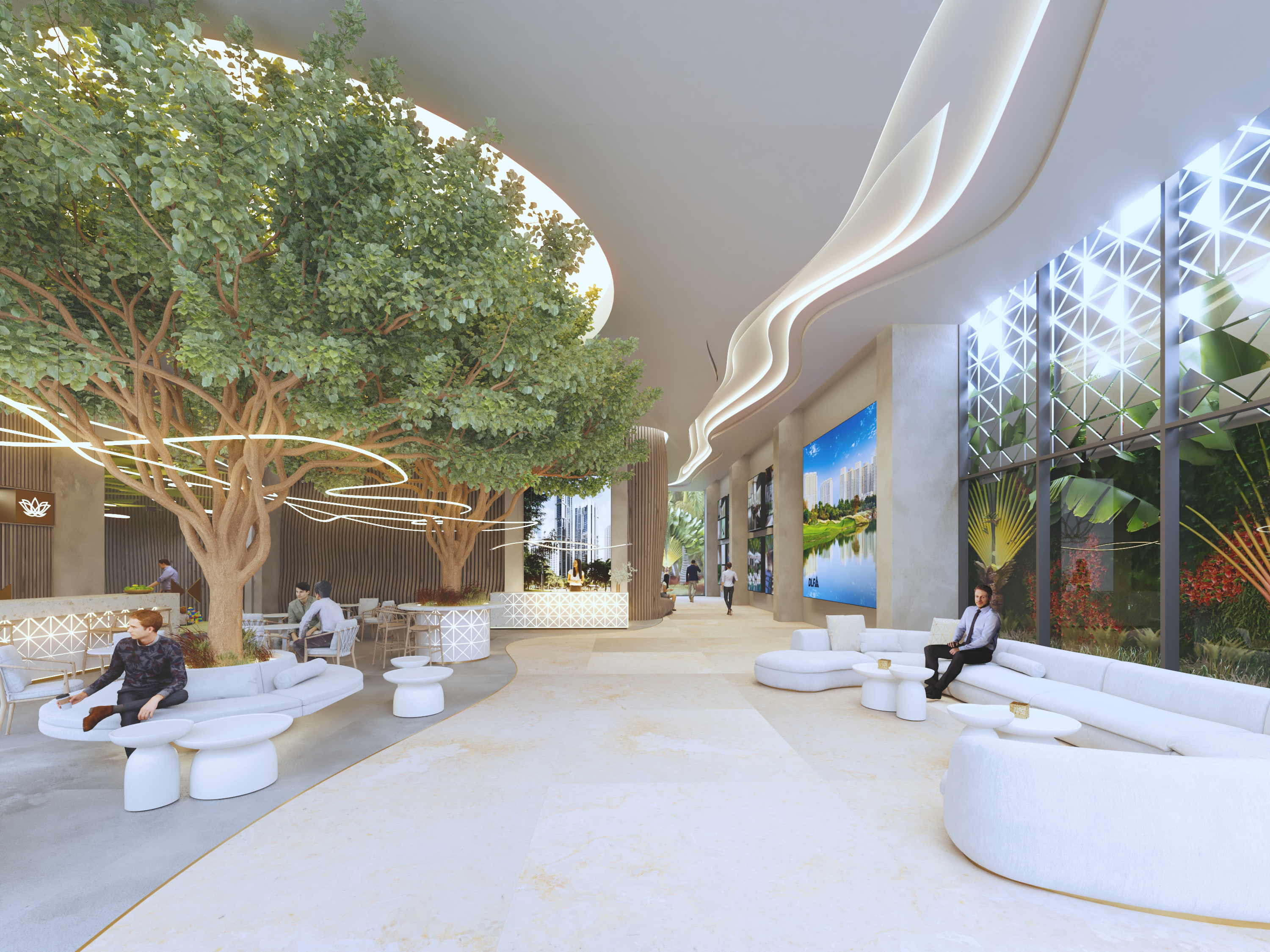interior shot create a stunning modern interior lobby filled with vibrant greenery large lush trees with rich green leaves and natural brown trunks gracefully arch over sleek white circular couches and matching tables incorporate soft ambient lighting with elegant swirling ceiling designs and warm glowing accents the floors and walls should feature a blend of light beige and subtle cream tones enhancing the tranquil atmosphere highlight a contemporary art piece on one wall depicting a serene blue and green landscape use abstract geometric patterns for the large windows allowing sunlight to gently diffuse into the space casting delicate shadows overall create an inviting harmonious environment blending natural elements with sophisticated design