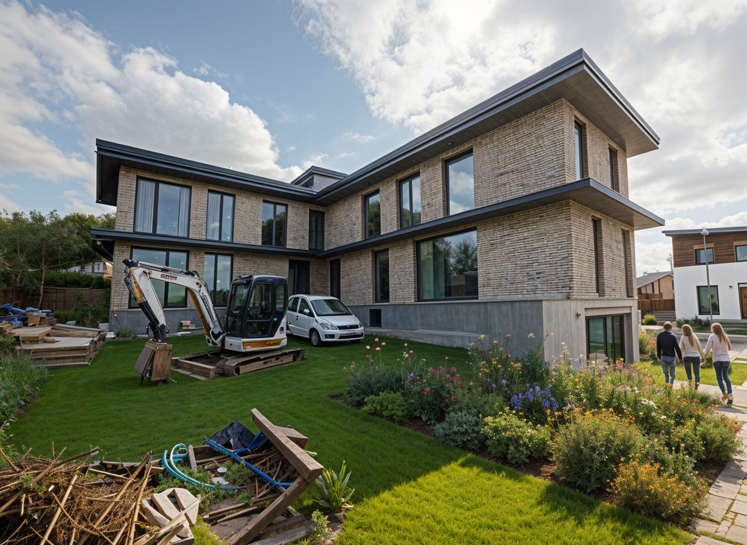 exterior shot add light brick facade add people silhouettes remove machines and cars add lawn to the first floor level add road add fence architecture
