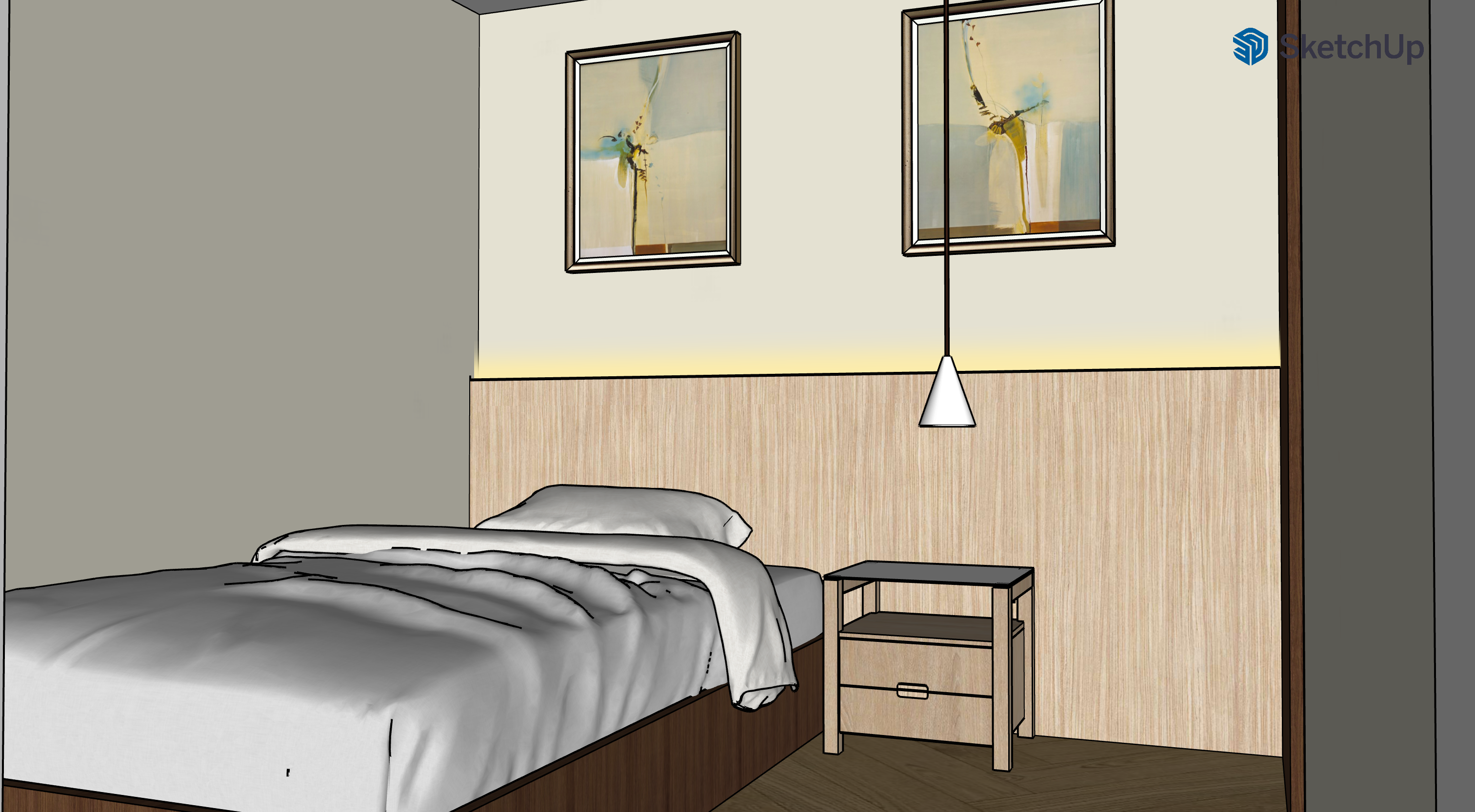 interior shot woodern floor in herringbone style layout single bed wood wall panel
