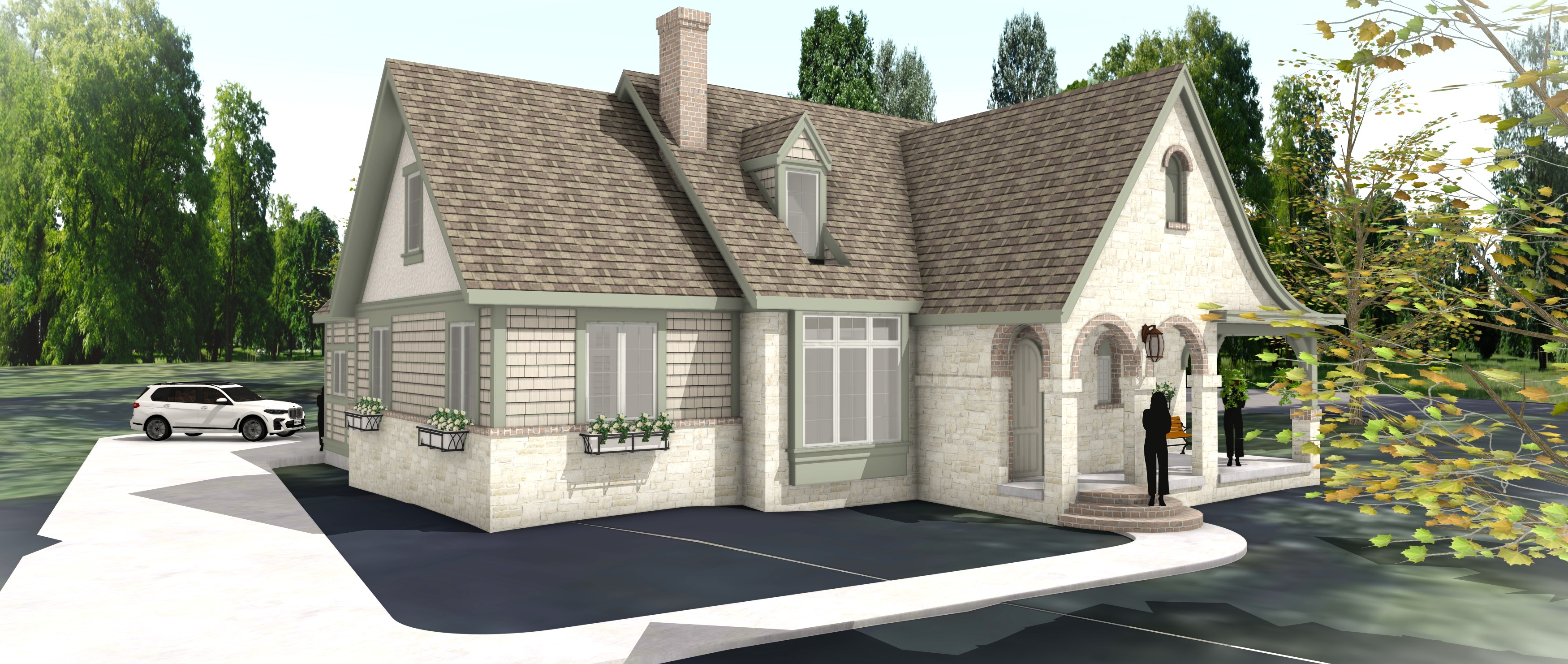 add realism to this shot with its tudor revival cottage style the same siding and stone that is shown in an evening time with the sun low highlighting the house