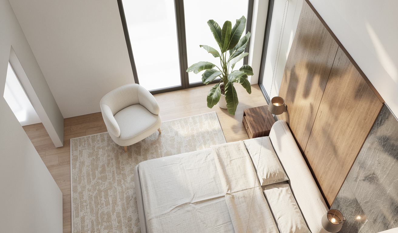 keep the exact same layout geometry proportions and camera angle do not change any colors materials or shapes preserve the existing design 100 enhance the scene with high realism improve material textures subtle imperfections natural shading soft reflections add realistic lighting and global illumination refine shadows to be soft and natural increase overall brightness of the room as if there is a central ceiling light simulate a warm diffused ceiling light source not visible in frame evenly illuminate the entire space without overexposure eliminate harsh dark areas while keeping depth and contrast maintain a calm soft natural atmosphere do not restyle redesign or reinterpret the space only enhance realism and lighting
