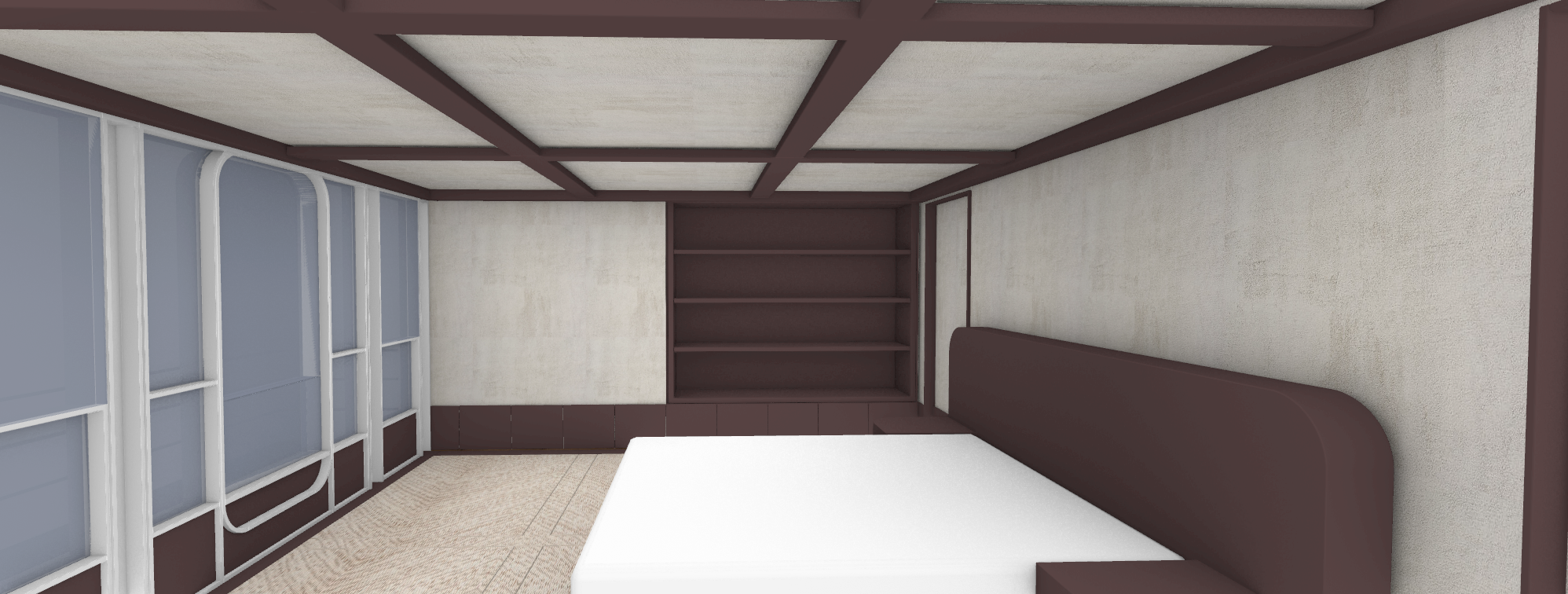 this is the main master bedroom of a luxury yacht the floor is dark wood and a beige rug there is a wood skirting but the wall is painted