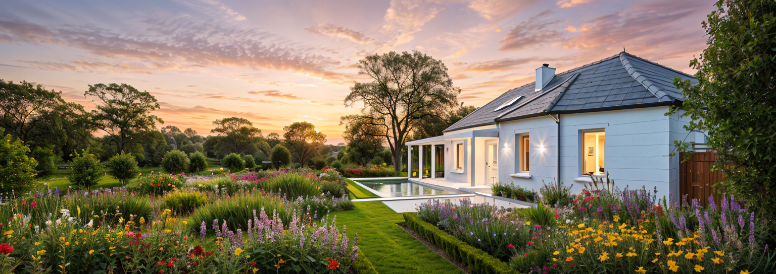 classical exterior shot in an australian rural setting at sunset with a lush green garden architecture