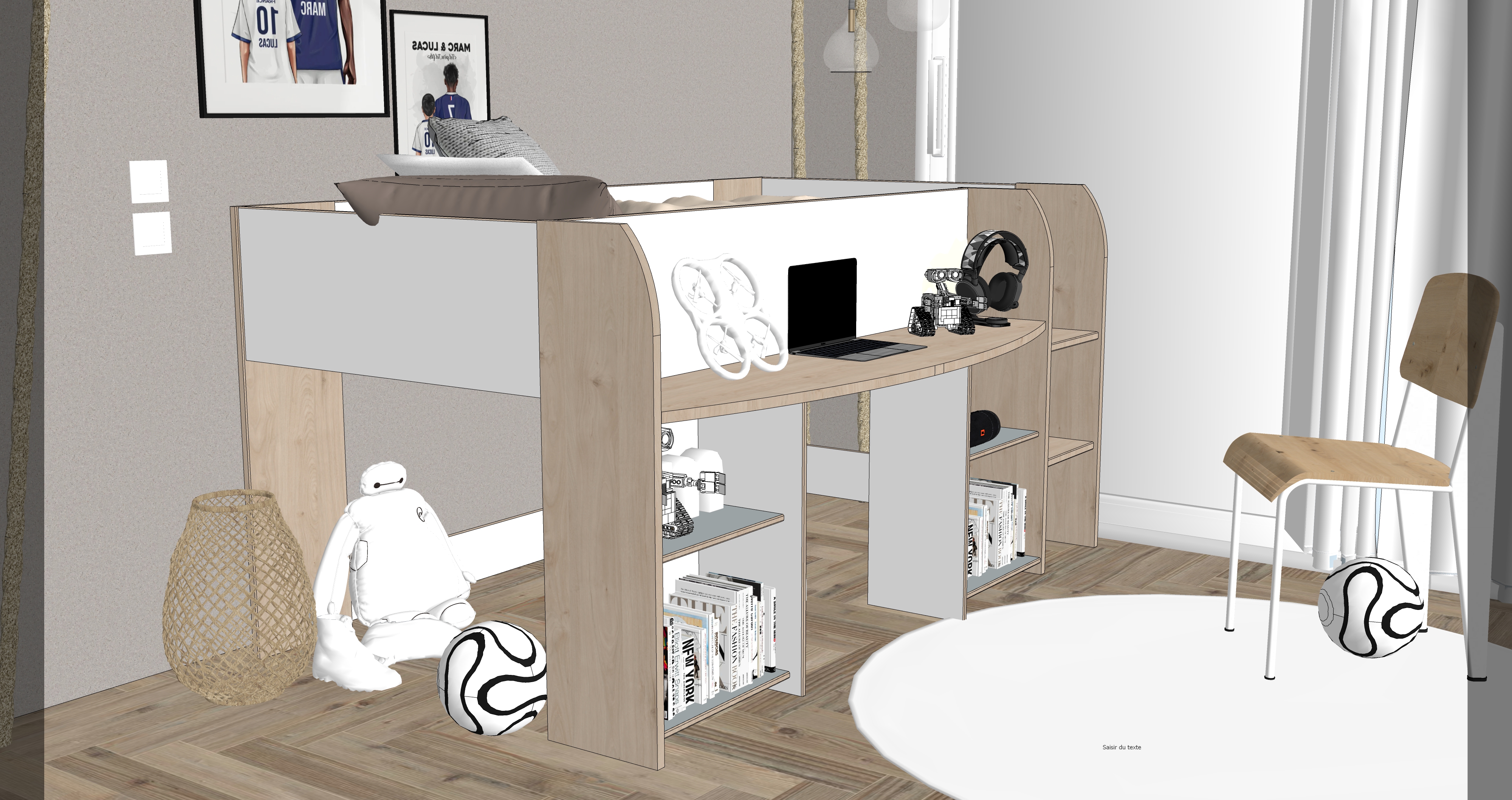 chambre d enfant chaleureuse et moderne ambiance douce et naturelle espace principal compos d une alc ve en bois clair int gr e dans un meuble mural blanc avec des tag res remplies de livres jouets en bois et paniers en fibres naturelles guirlande lumineuse d licate accroch e sous les tag res clairage doux et cosy au sol tapis rond tress beige mur avec texture de terre cuite lampe rafia en haut de l image pour clairer la pi ce dans la pi ce une fen tre apportant une lumi re naturelle douce petit train en bois pos sur le tapis palette de couleurs naturelles beige blanc bois clair teintes douces et apaisantes style scandinave chaleureux et minimaliste