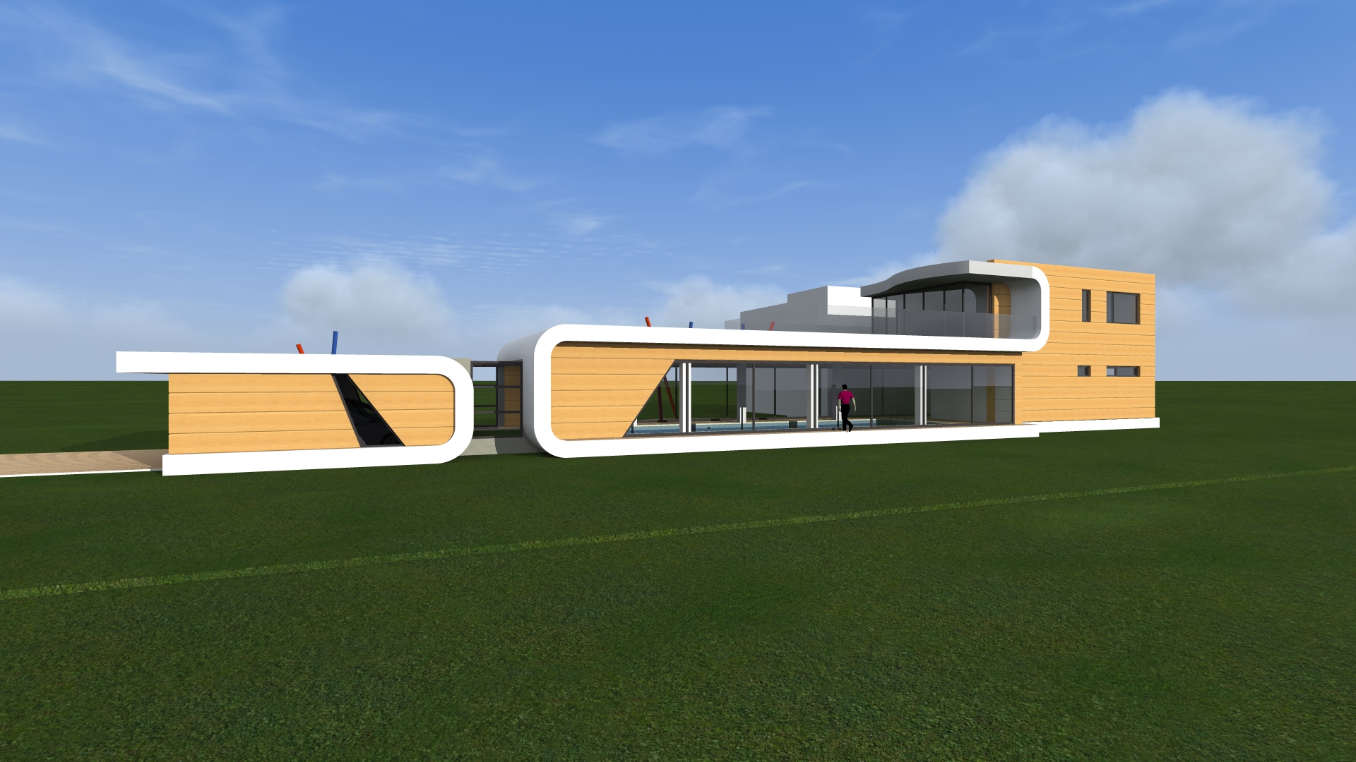 convert the image into a realistic outdoor photograph with professional architectural aesthetic maintaining 100 of the geometry and layout applying authentic materials afternoon warm lighting with soft shadows and a sharp photorealistic result use real images of people instead of the ones in the original image add landscape design behind the building do not change material colors