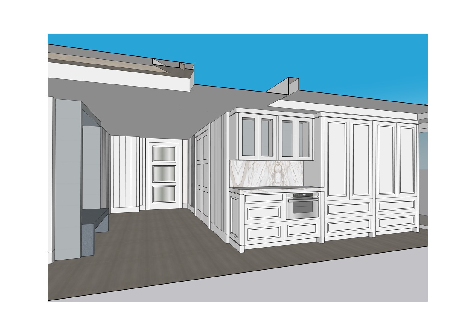 transform the provided elevation into a hyper realistic interior photograph that is indistinguishable from a real professionally shot interior design photograph this must read as a real space captured by a camera not a rendering not a visualization not architectural cg not concept art and not an illustration geometry lock non negotiable preserve the exact original geometry layout proportions ceiling details wall depths panel divisions openings doors cabinetry locations millwork dimensions built ins and circulation paths with zero architectural changes nothing may move scale simplify or be reinterpreted geometry must remain absolutely unchanged camera derivation critical derive the camera position height angle and framing strictly from the uploaded elevation eye level interior photography centered or naturally balanced composition 24 35mm interior lens feel no dramatic angles no stylized framing do not reuse or approximate camera framing from any previous image remove all drawing artifacts completely remove all linework cad edges drafting outlines diagrammatic shapes sketch artifacts nothing may appear outlined flat schematic or illustrative the elevation must be visually reinterpreted as a finished real interior photograph material realism rules wood if present smooth solid plank material extremely subtle restrained grain matte or soft satin finish only no graphic patterns no decorative striping no visual noise wood must absorb light gently never glossy or sharp fabric upholstery if present soft compression subtle seams gentle shadowing natural fabric texture no flat color blocks stone slabs if present light natural veining soft organic variation low contrast no symmetry no bold or busy patterns stone must feel heavy and grounded walls fine surface texture slight tonal variation never flat paint edge construction realism all edges corners joints and transitions must be softly broken and physically realistic no razor sharp corners no cgi perfect edges slight construction tolerances only everything must read as fabricated installed and dimensional lighting photographic behavior lighting must behave like real high end interior photography natural daylight only unless otherwise specified realistic light bounce gentle shadow falloff uneven exposure distribution subtle brightness variation across surfaces avoid studio lighting uniform illumination over clean exposure global illumination look slight softness is preferred over sharpness camera image imperfections very important introduce subtle photographic characteristics gentle lens softness micro exposure variation natural contrast roll off mild atmospheric depth primary plane sharp background slightly softer the image must feel captured not generated absolute constraints no creative interpretation no stylization no exaggeration no added or removed elements any deviation from the original elevation geometry or intent is unacceptable negative prompt always include architectural rendering 3d visualization cgi unreal engine octane vray sketchup look flat textures graphic lines outlined edges over sharpened studio lighting concept art illustration ai look plastic materials glossy wood high contrast grain perfect symmetry keep design as shown in the picture keep the design as it is in image light cabinets are white and brown cabinets are white oak keep design in the image as it is including materials keep the materials as in image