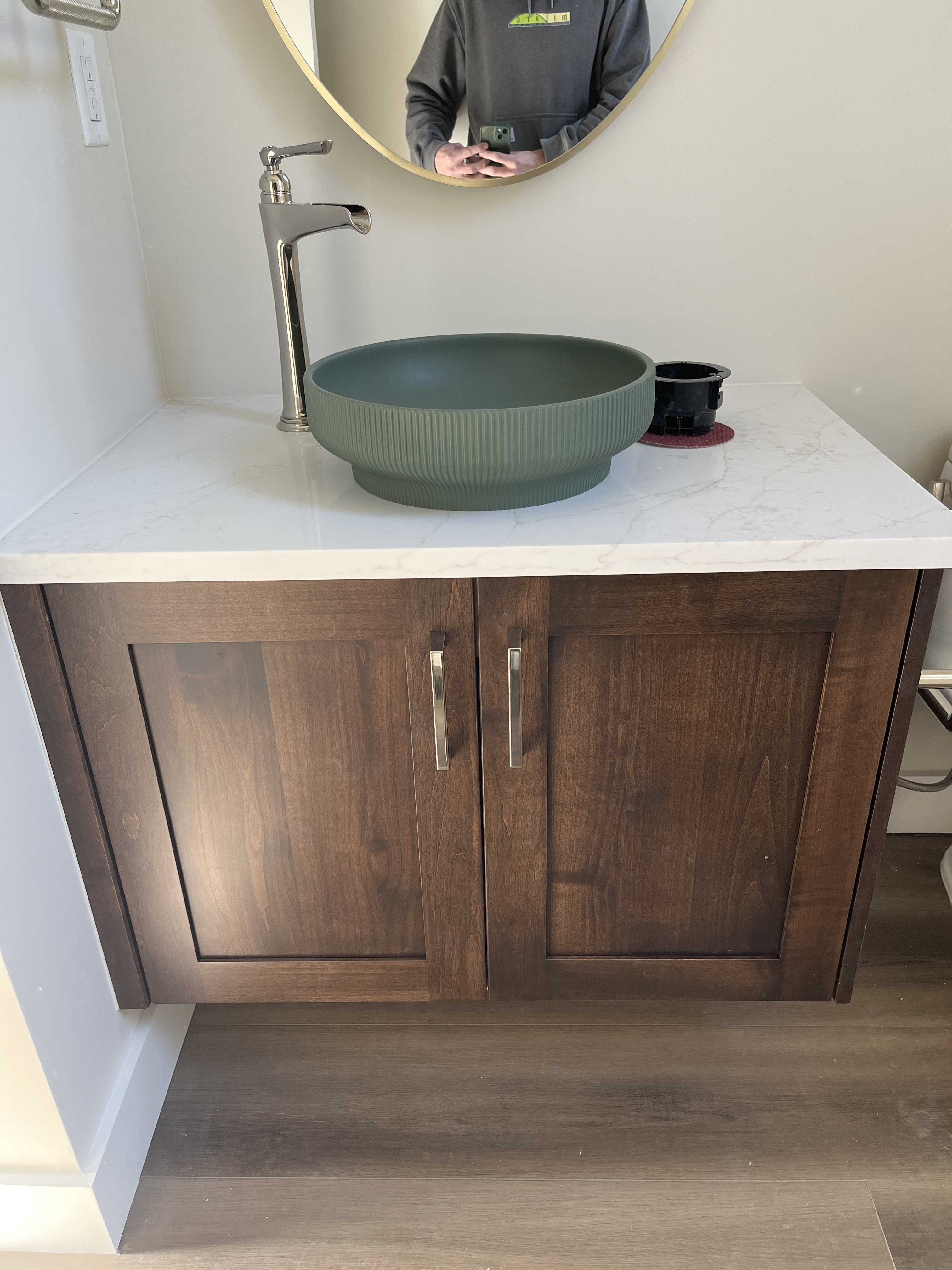 remove person in the mirror remove black item from countertop clean floor