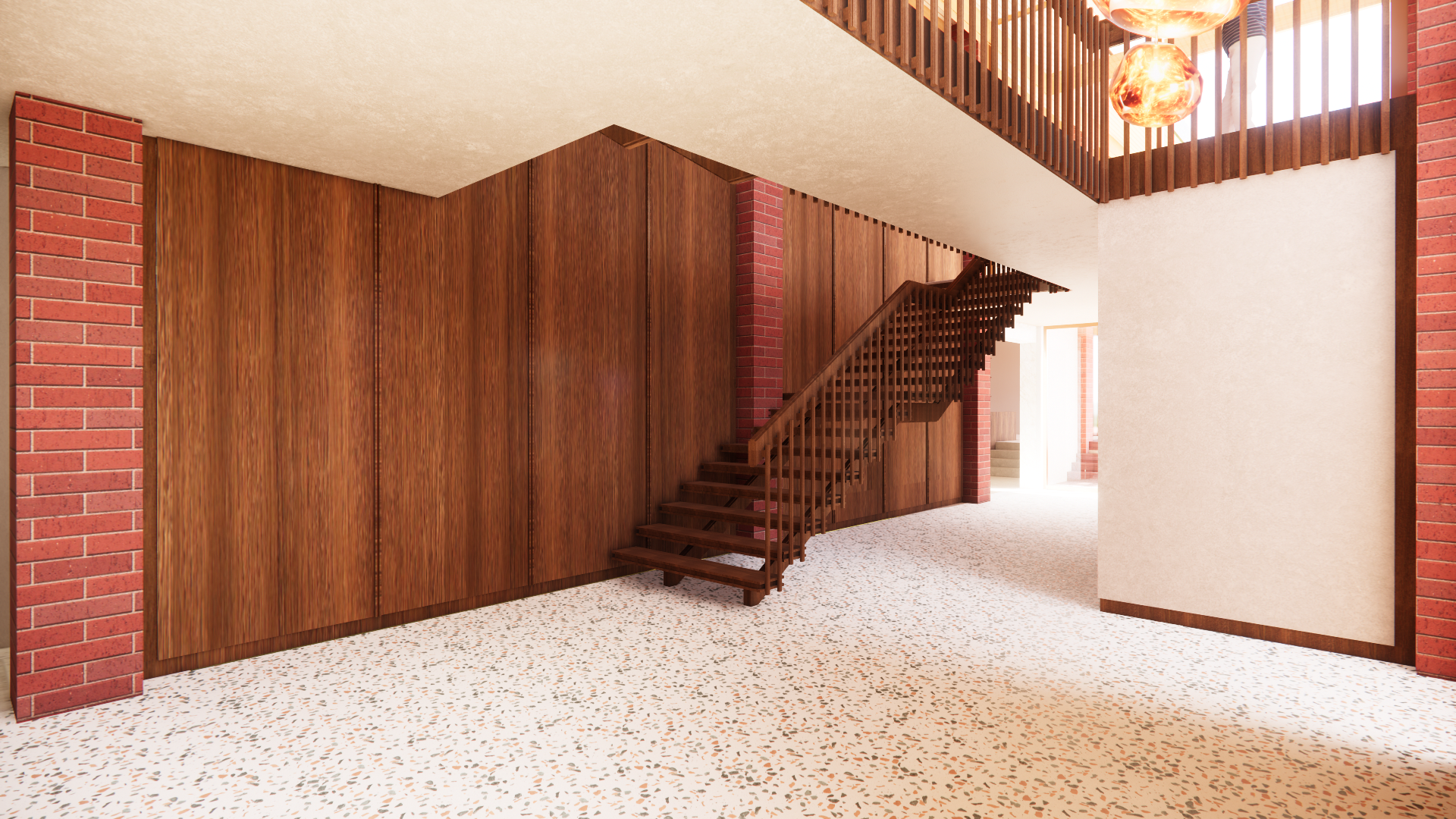 render a photorealistic 3d perspective of this mid century modern masterpiece house in a los angeles ca keep model geometry the same windows doors roof walls do not change the view only enhance the current materials and add soft sunlight with atmospheric depth render in hyper realistic architectural visualization quality 8k resolution