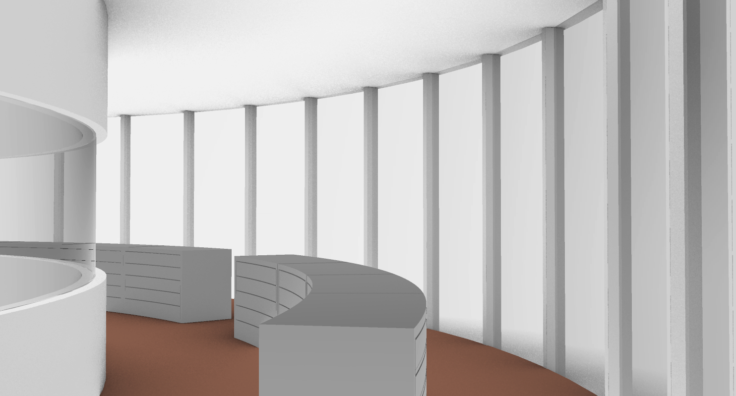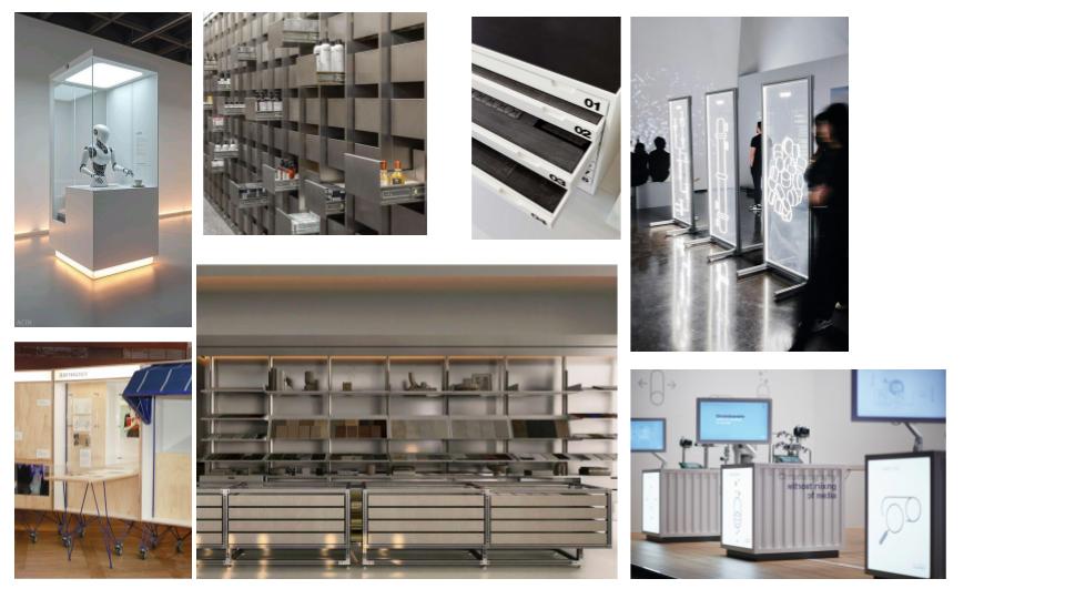 exterior shot curved walkway space exhibition pedestals line the middle of the walkway displaying robots and architecture drawers open up to have screens of the displays led transparent screens on the right glass wall