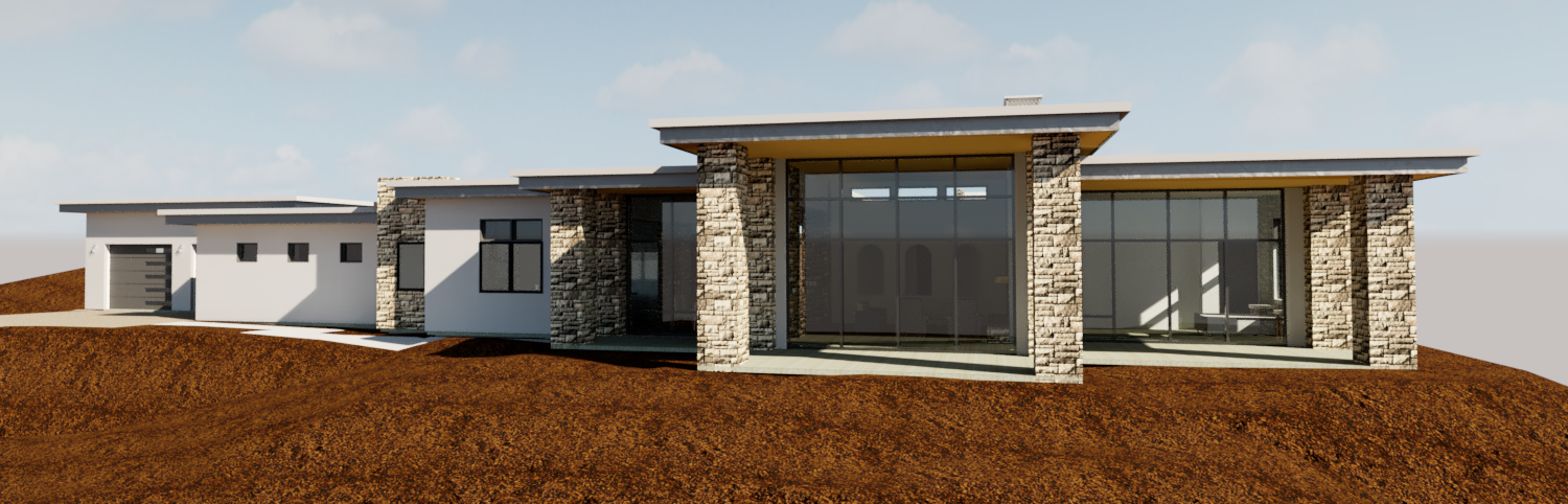 modernist exterior shot modern house with a sleek design featuring stone walls in light gray with detailed texture large windows with black frames reflecting the surroundings the white sections of the house contrast with the rich reddish brown soil of the terrain the sky is bright with a few soft fluffy clouds creating a serene open atmosphere soft natural lighting casts gentle shadows adding depth and dimension to the house s architecture architecture