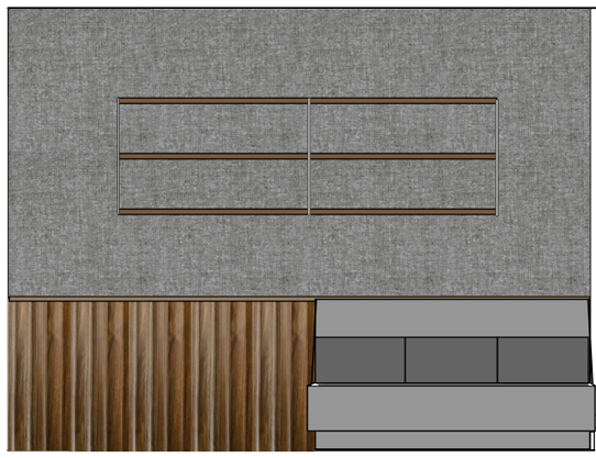 interior shot wood wainscot next to grey banquette wood and silver metal shelving on grey linen wallpaper