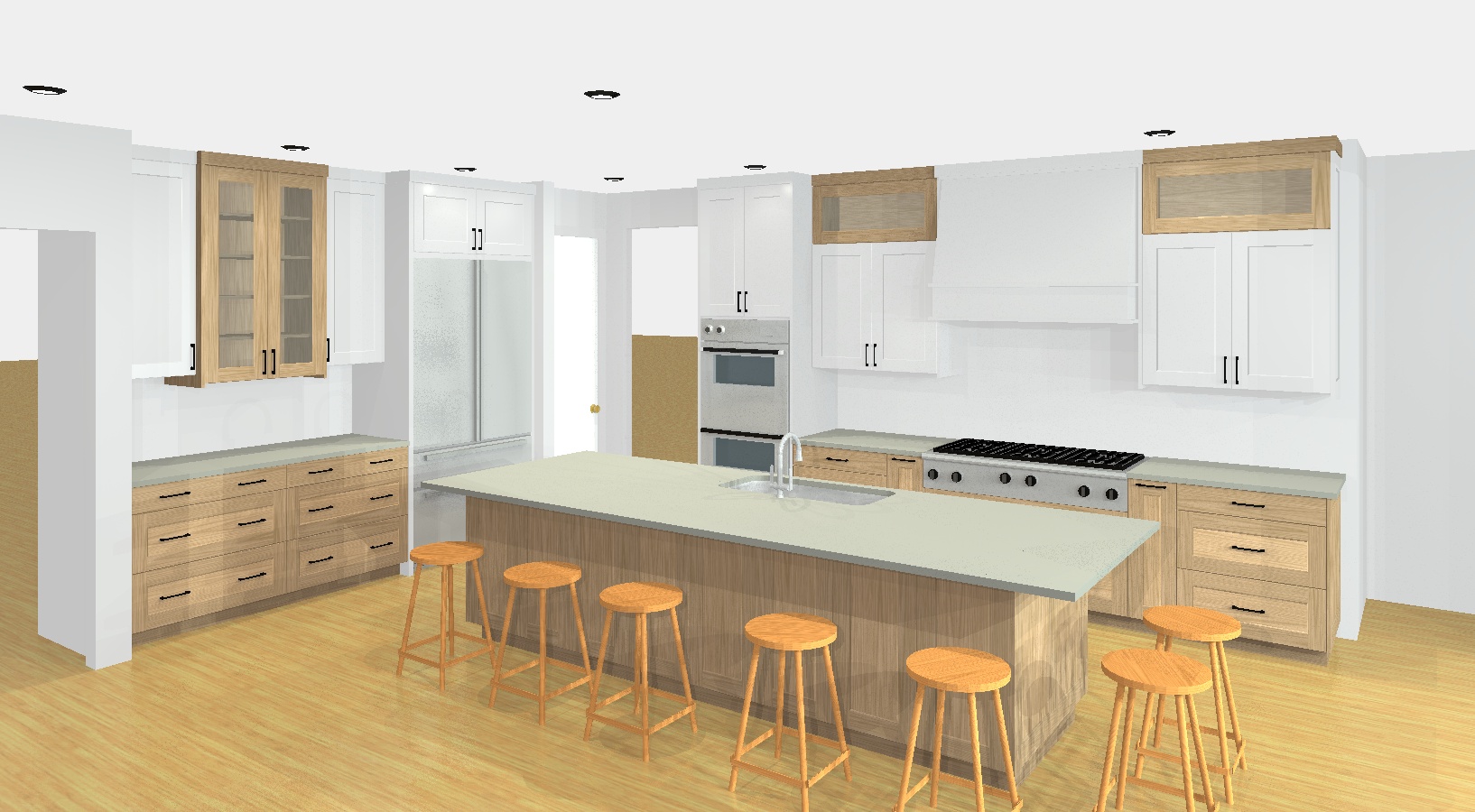 render a modern kitchen with a warm and inviting atmosphere emphasize a spacious white layout with sleek cabinetry use warm dark brown white oak wood accents on the cabinet tops and stools the kitchen island should be a light neutral color complemented by a brushed steel faucet add soft ambient lighting from recessed ceiling lights the floor should be a cool light oak finish enhancing the cozy feel incorporate minimalistic black handle details on cabinets for a contemporary touch ensure the overall mood is bright and welcoming with a balance of natural and modern elements