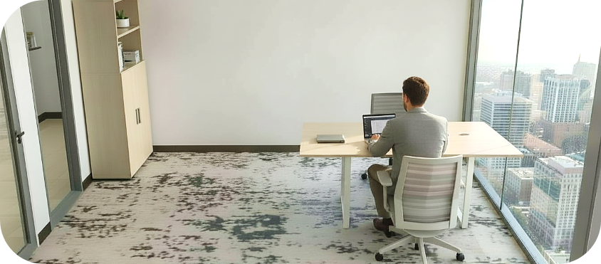 strict photorealistic enhancement only preserve exact furniture geometry layout scale and placement as modeled do not alter any object proportions hardware pulls or profiles do not add remove or substitute furniture or d cor maintain all specified finishes laminates wood grains fabrics and vinyl colors exactly as shown preserve wood tone grain direction and fabric color accuracy enhance lighting realism only using soft global illumination realistic shadow depth subtle material texture clarity and natural daylight balance 4000 4500k no redesign no reinterpretation no styling changes use high dynamic range lighting with realistic ambient occlusion and physically accurate reflections maintain true to spec color rendering remove the man and replace with a professional woman working add downtown dallas buildings outside of window