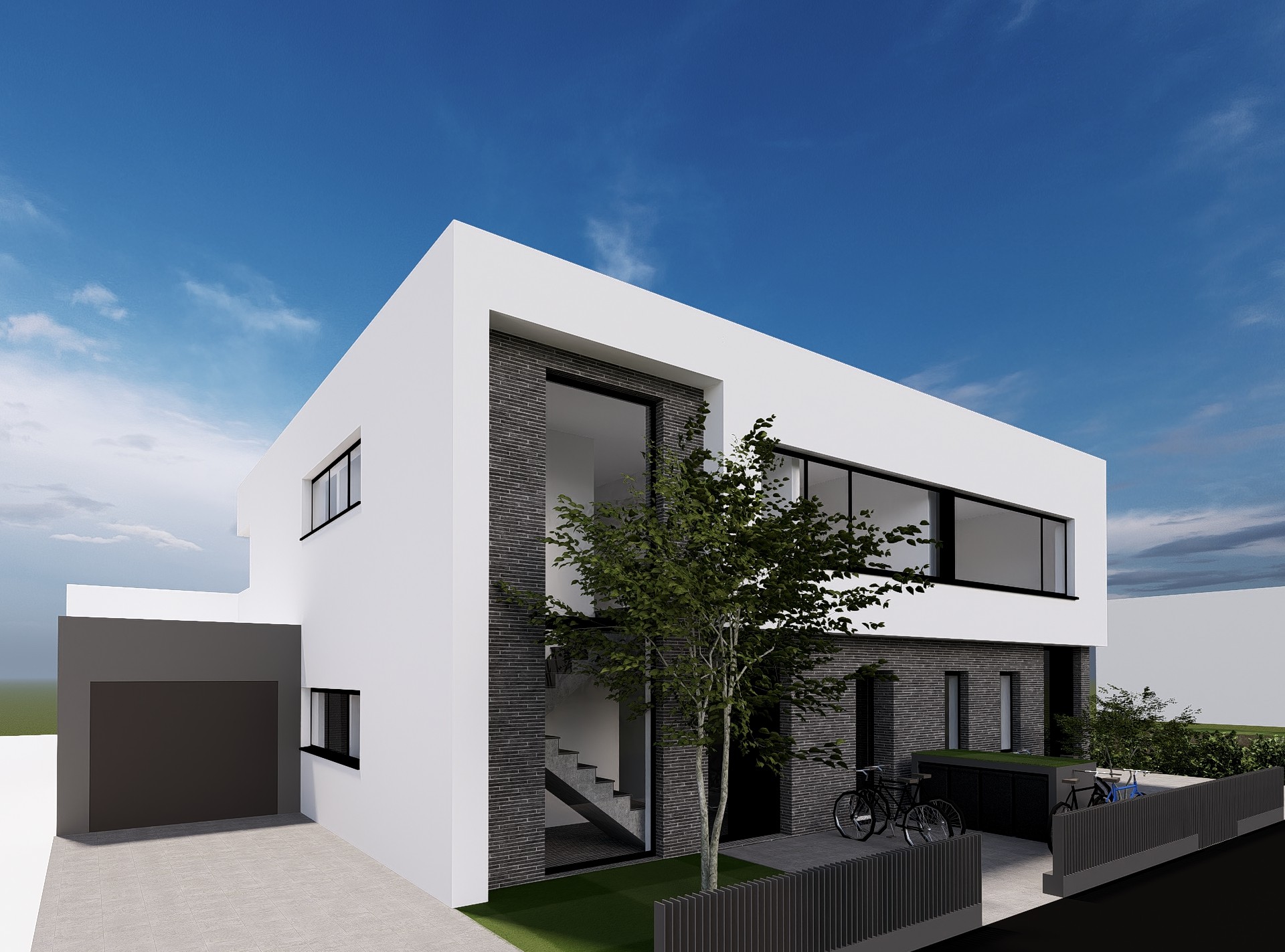 create a realistic image add 2 3 small birds in the sky ad a oldtimer alfaromeo cabrio in a front of the garage left side