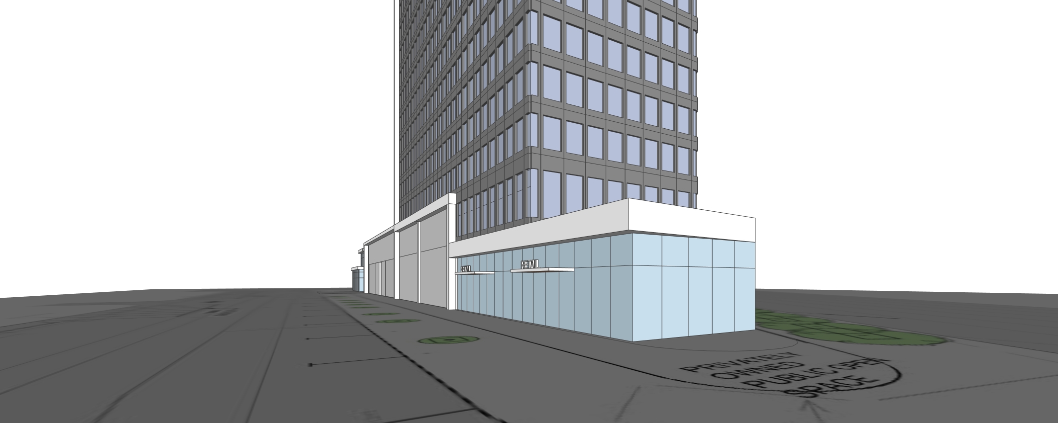 maintain mass add retail ground floor on left mass only daytime view no cars glass tower above remove people