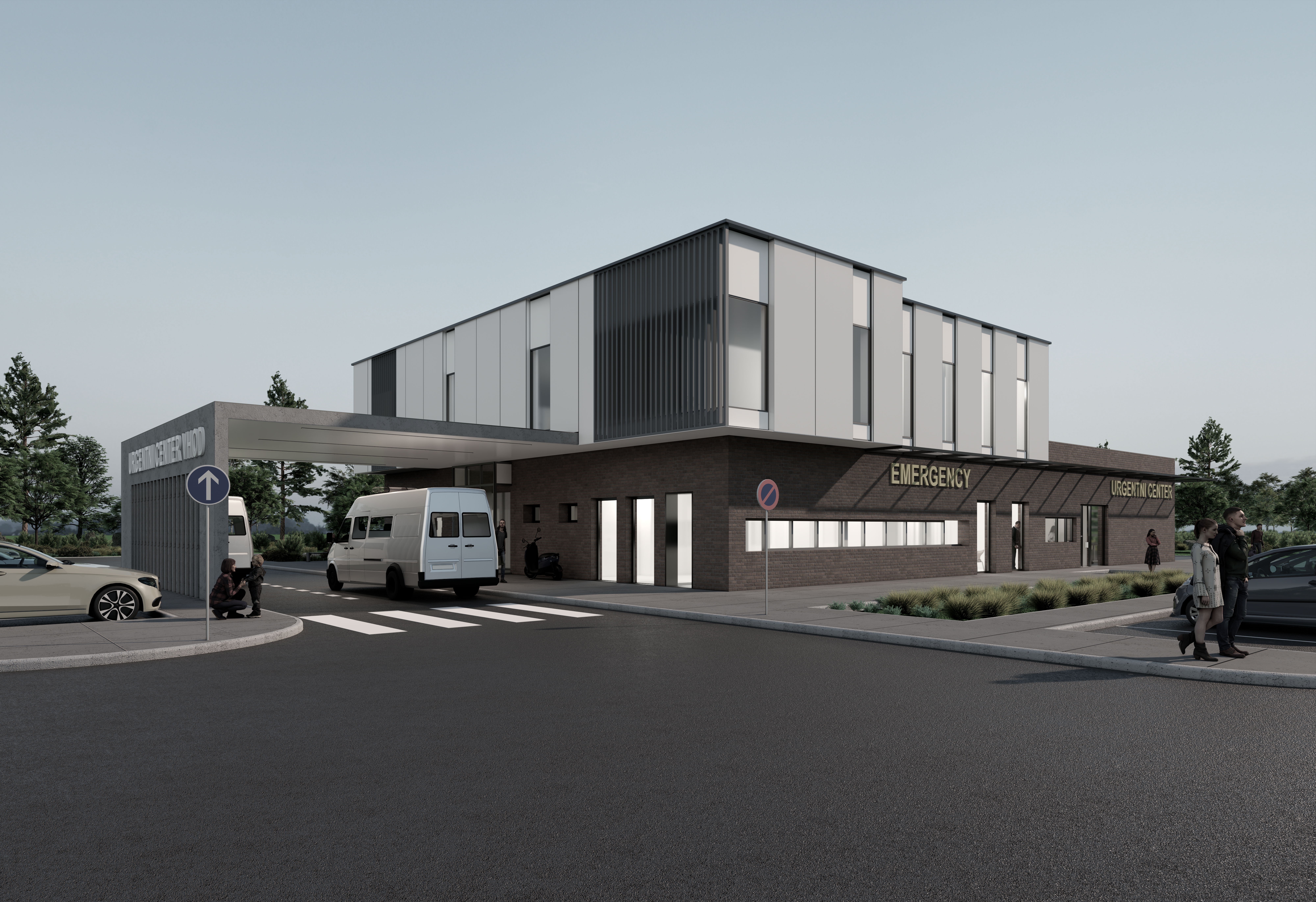 the picture shows a new ambulance station with white shiny aluminum panels above and a brick facade below on a bright autumn day the sun is shining through the clouds after the rain in front of the building under the canopy are two young doctors people are walking with open umbrellas the ambulance has its emergency lights on in the partially wet asphalt surfaces and sidewalks covered with light concrete slabs in front of the building reflections of the sky and nature and the building can be seen behind the building is a slightly autumn colored forest in yellow and green autumn shades the light of the picture is slightly cold with a high depth after the rain the vehicles have their lights on under the canopy is a white van with the markings of the ambulance