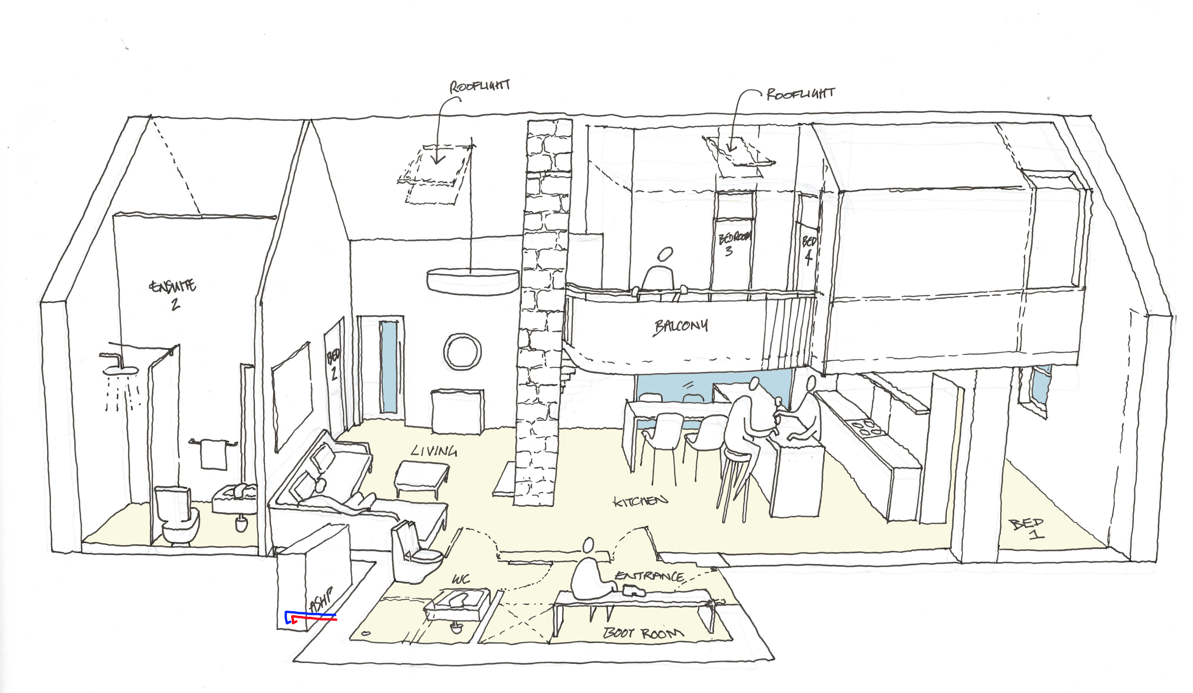 this is the conversion of an old 100 year old house school house into a living space with a terrazzo floor and lime rendered walls the central chimney is stone and the furniture is modern architecture