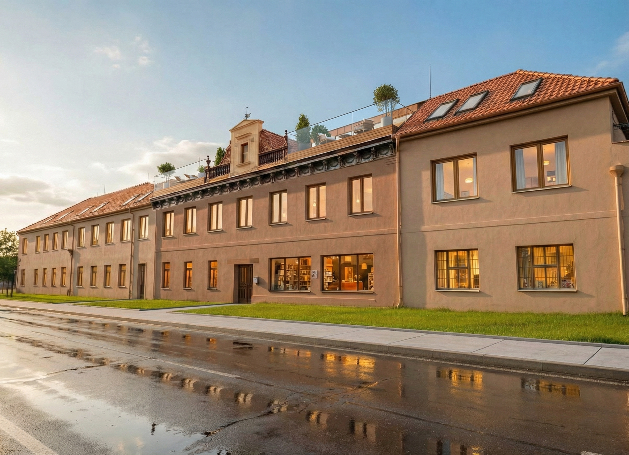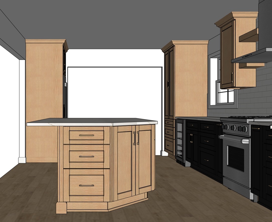 create a beautifully rendered modern kitchen scene use a warm inviting color palette light natural wood for the tall cabinet and island smooth black paint for the lower cabinets sleek stainless steel appliances with a matte finish white subway tile backsplash and white quartz countertop light brown wooden floor for added warmth add soft lighting to create a cozier atmosphere natural light streaming through large windows enhances the friendly fresh ambiance just make a large open room without windows through the opening keep the cabinet layout same use the same pulls and knobs as shown in the example no hanging lights above the island