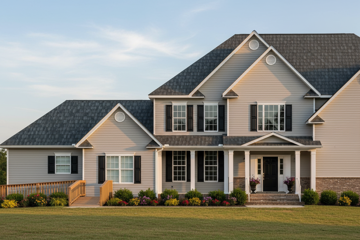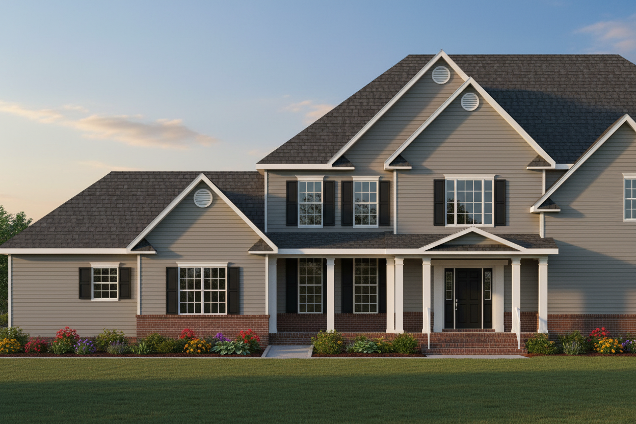 remove numbers labels and lines create a realistic daytime color rendering using the following james hardie cobblestone board and batten siding white trim white windows white porch columns us brick aspen trace brick tricorn black front door shutters and garage door window grids on top half of glass with open glass on botttom half of windows progress craftsman style black coach lights on each side of garage door gray concrete driveway green yard mulch bed around front porch and walkway with green shrubs native to indiana