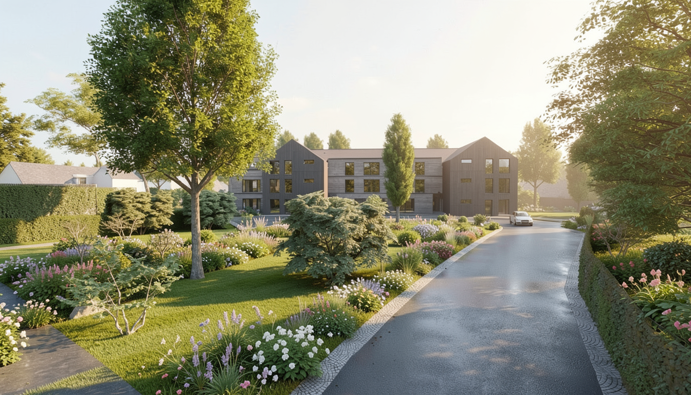 photorealistic visualization spring sun and clouds gentle sun garden and green grass replace the wood on the facade with gray bricks the road is asphalt