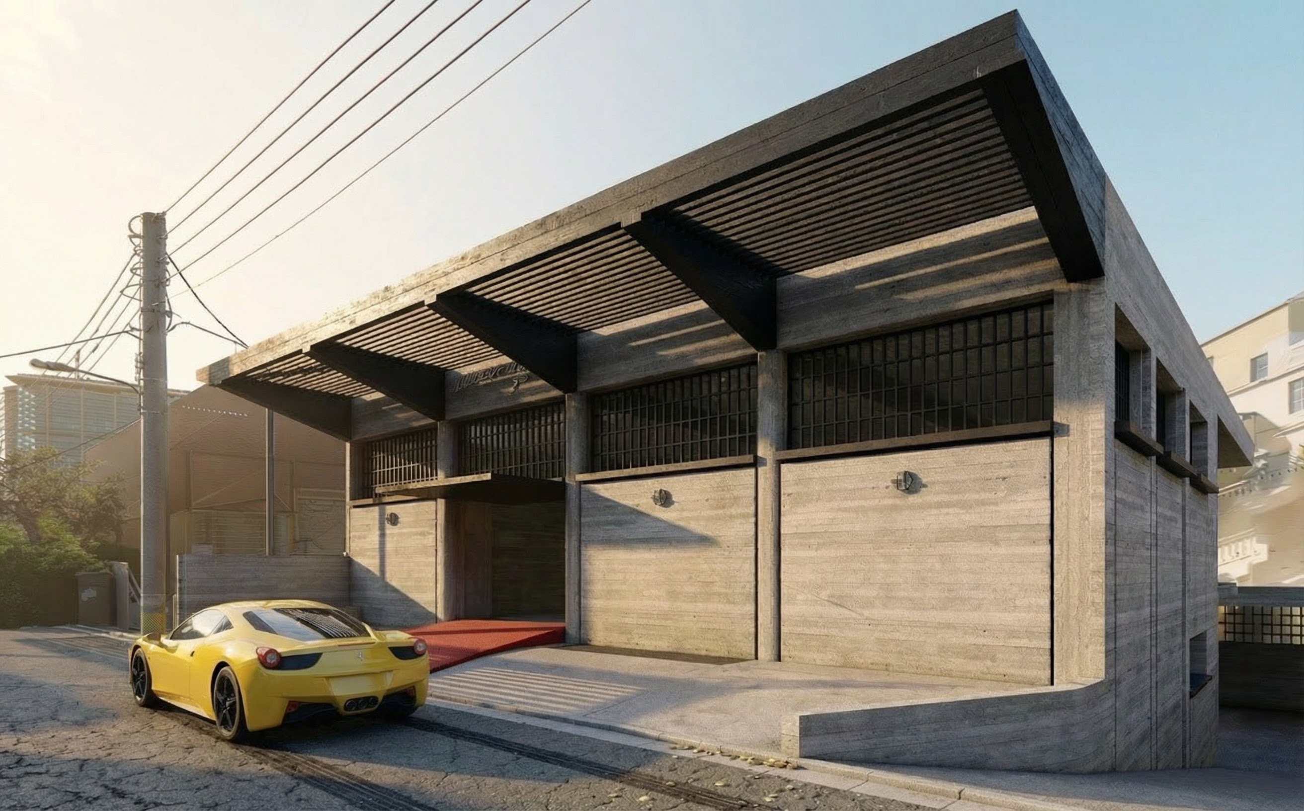 soft warm light from the window on the right side lamp above the table is audo copenhagen hashira floor is black stone with dark grey grout grey kitchen is made of brushed steel microwave and coffee machine are the same black colour