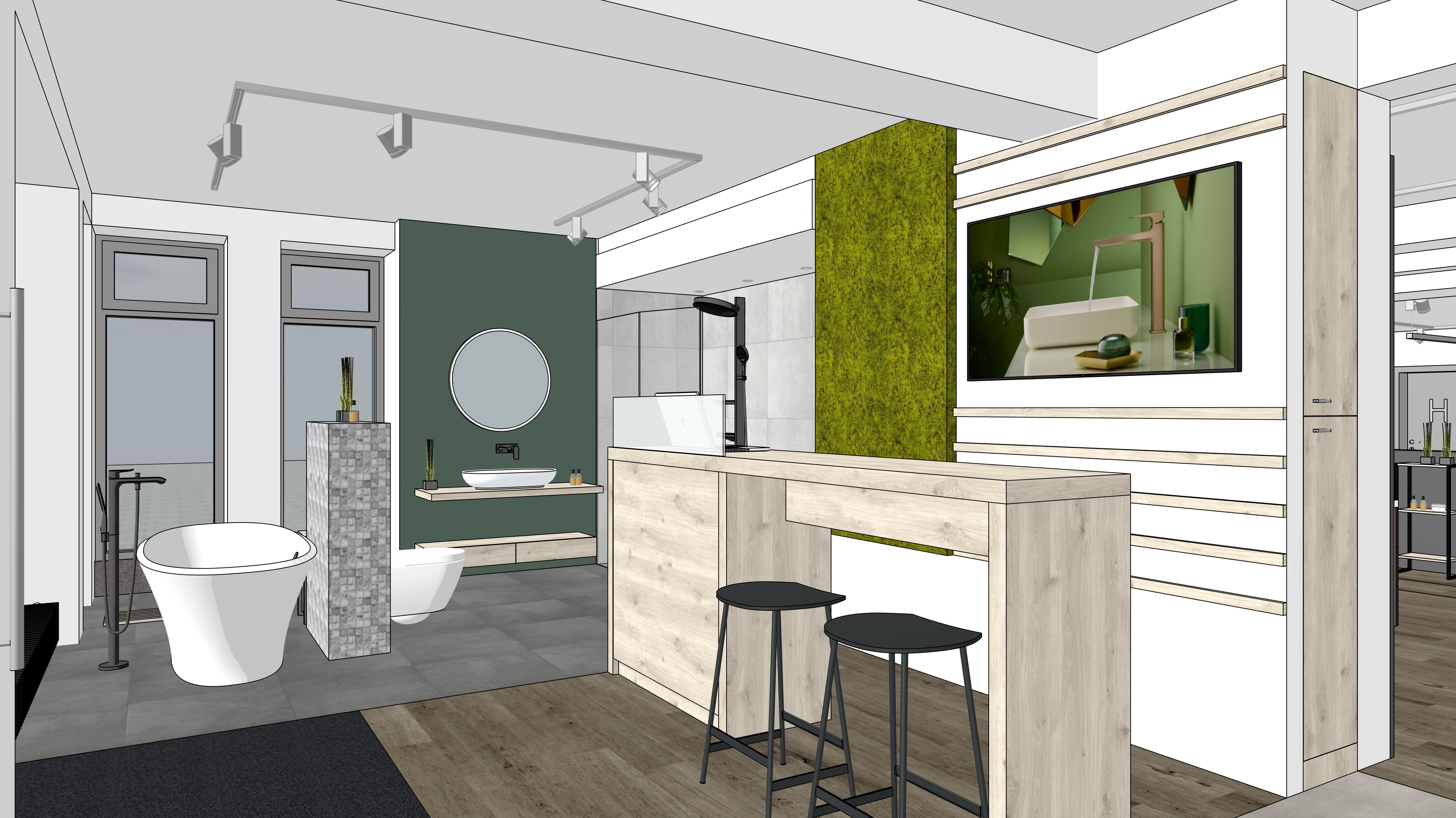 use the provided cad perspective strictly as the sole geometric and compositional reference preserve all elements exactly as given including proportions layout camera position field of view and object placement do not add remove reinterpret or redesign any architectural or interior elements no new objects furniture or light sources may be introduced under any circumstances all visible text within the image must be preserved exactly as shown do not alter reinterpret stylize translate or replace any text typography spelling layout and positioning must remain 100 identical to the original enhance the image exclusively through photorealistic rendering quality apply realistic materiality to all surfaces based on their implied function and construction maintaining the original design intent surfaces should exhibit subtle physical properties such as texture depth light absorption soft reflections and where appropriate controlled specular highlights or mirror effects avoid exaggerated or stylized materials aim for believable natural realism lighting introduce natural daylight entering the space in a plausible and context appropriate way the daylight should appear realistic and balanced without being limited to overcast conditions detect and utilize all light fixtures that are present in the original cad image these must visibly emit light and contribute to the overall illumination of the scene artificial lighting should produce realistic light falloff gentle highlights and nuanced shadow transitions do not add or invent any additional light sources beyond those already visible in the image the final image should read as a faithful photorealistic translation of the original cad perspective not as a reinterpretation