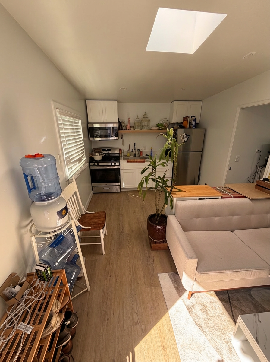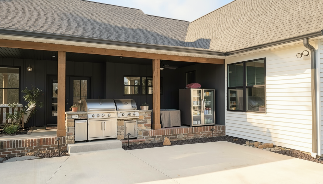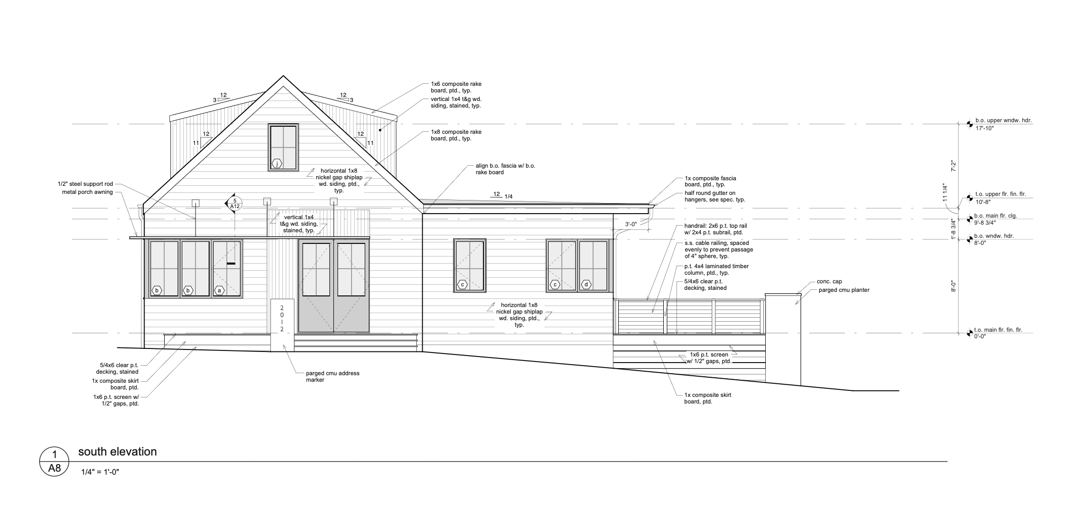 exterior is a slight off white nickle gap lats verticle wood slats suround the front door and match the wood on the gables black window framed windows