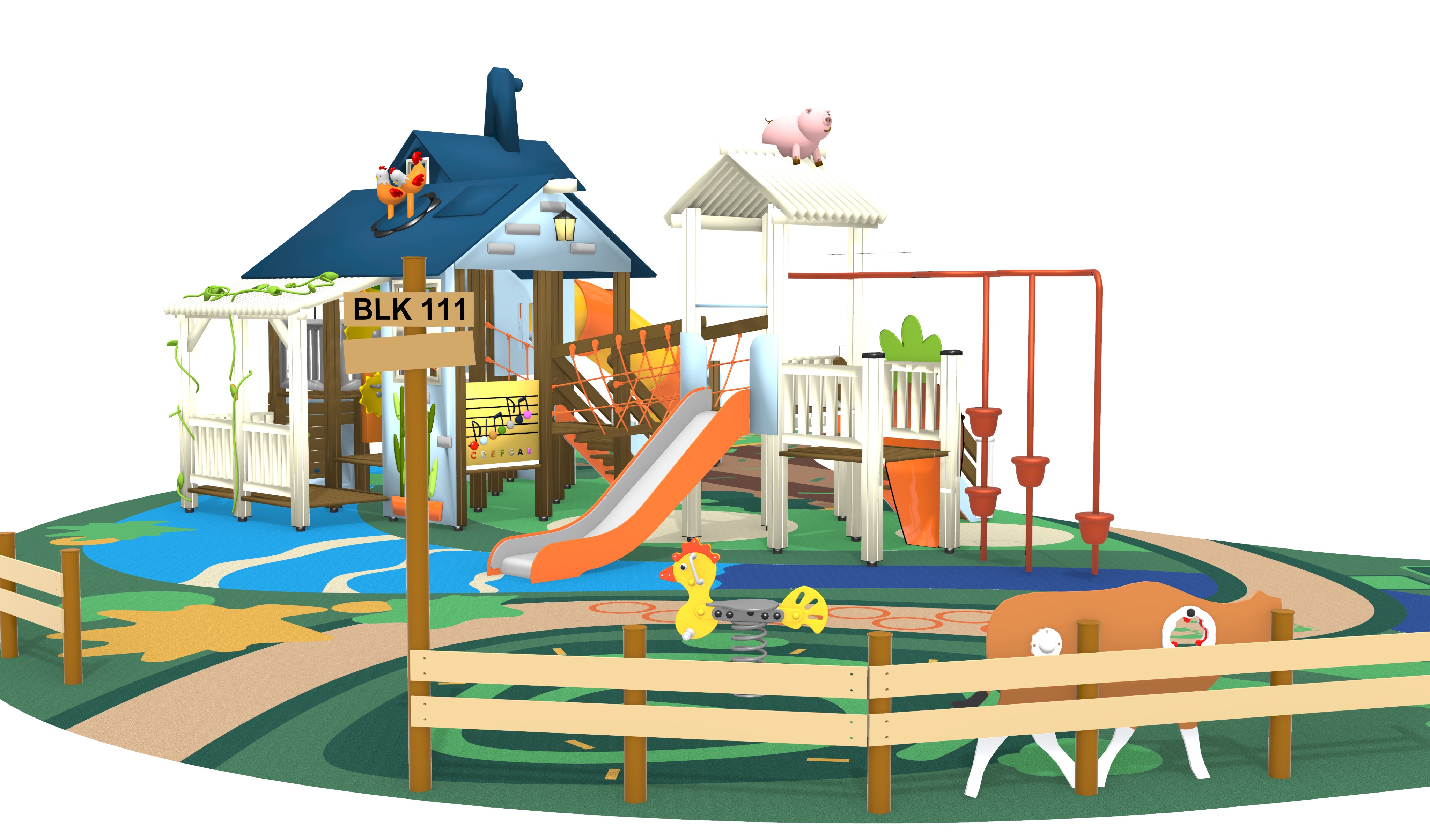 hyper realistic architectural render of a bustling outdoor children s playground area suitable for a luxury magazine feature do not add any playground structure or playground flooring other than what is given visual foundation composition the overall scene composition camera angle and surrounding outdoor elements like implied landscaping are inspired by singapore park outdoor environment details the setting is clearly outdoors with lush well maintained landscaping surrounding the playground this includes tasteful trees and shrubbery that frame the scene without obstructing the playground the ground beneath and around the playground should be appropriate for an outdoor play area e g safety surfacing grass vibe lighting liveliness the lighting replicates a vibrant day time with warm directional light primarily from the side creating rich highlights only making soft shadows no harsh shadows accepted the scene is exceptionally lively and bustling populated with a greater number of diverse children actively and dynamically playing on and around this specific playground model climbing sliding interacting adults are also present supervising or engaging in relaxed interaction within the well landscaped area the atmosphere is highly energetic happening and refined all materials and textures wood metal safety surfacing foliage building facades are rendered with a 4k uhd level of hyper realism and tactile quality matching the previous luxurious aesthetic output quality the final image should be clean free of watermarks and convey a premium aspirational quality